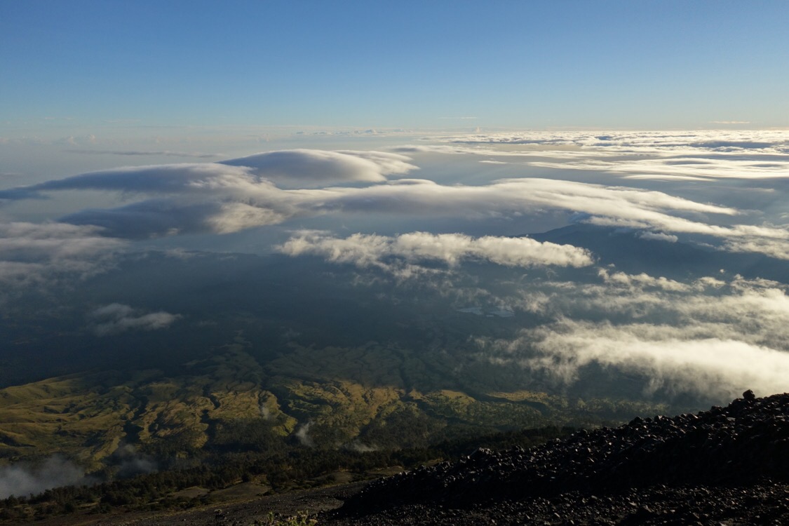 day3:两点起床简单吃了些早餐开始向3726m的山顶进发。这段路理论上是3个小时左右但战五渣的po主一直到7点才被向导拉到顶峰orz 中途有数次让我继续爬不如狗带的想法…… 因为到顶峰时天气已经转恶,风大雾大完全看不到下面的火山湖还有毛毛细雨,向导则让我们尽快下撤。但非常神奇的是接近五个小时的上山路程下山却不过2个小时便回到了营地orz 之后休息到吃过午饭,下午从2600米下撤到2000米左右的火山湖边。在距离营地10分钟左右的温泉里泡了一会儿,当晚住在火山湖边。