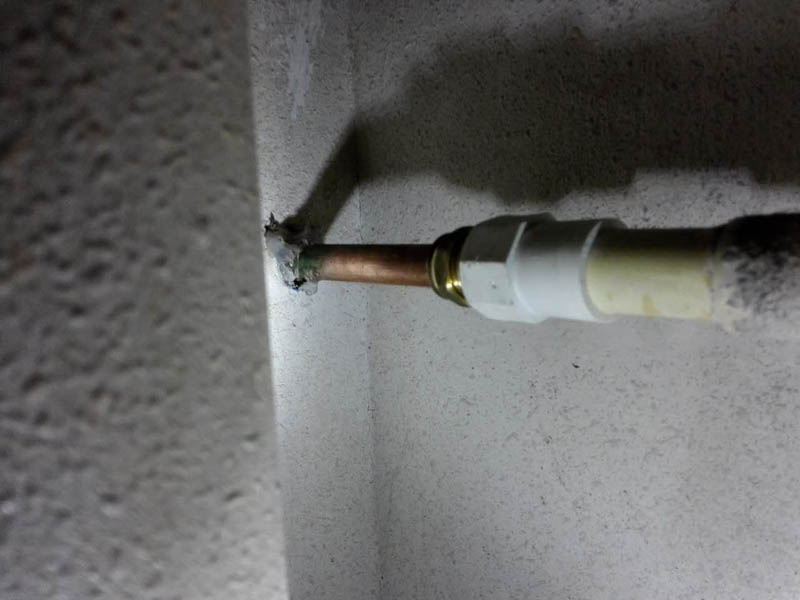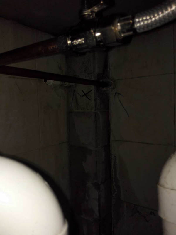 我找到今年修漏水的照片了,给你做个参考。漏水是地方是墙上的一段穿墙PVC管。修好前这个样子。
