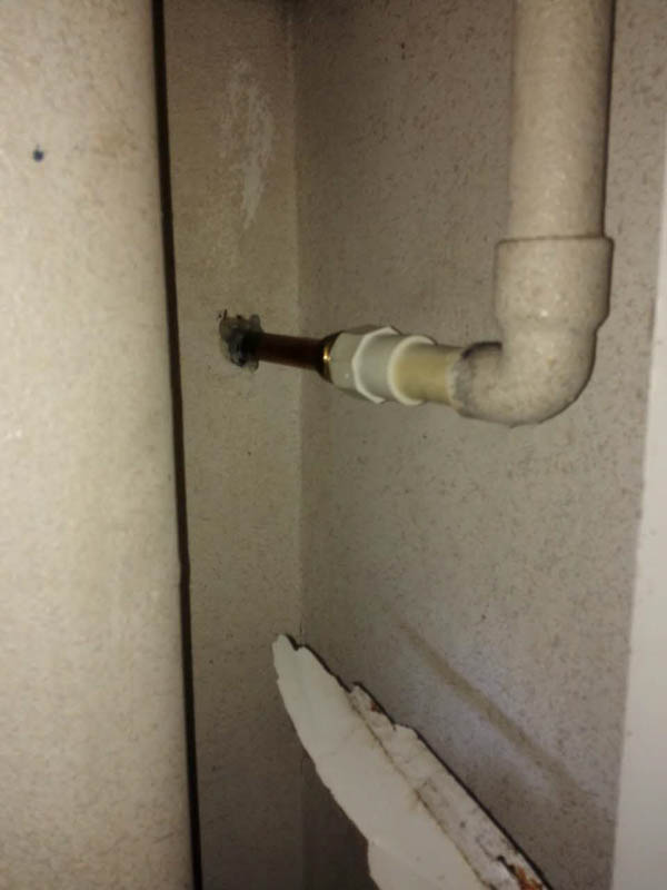 漏水是地方是墙上的一段穿墙PVC管。修好前这个样子。