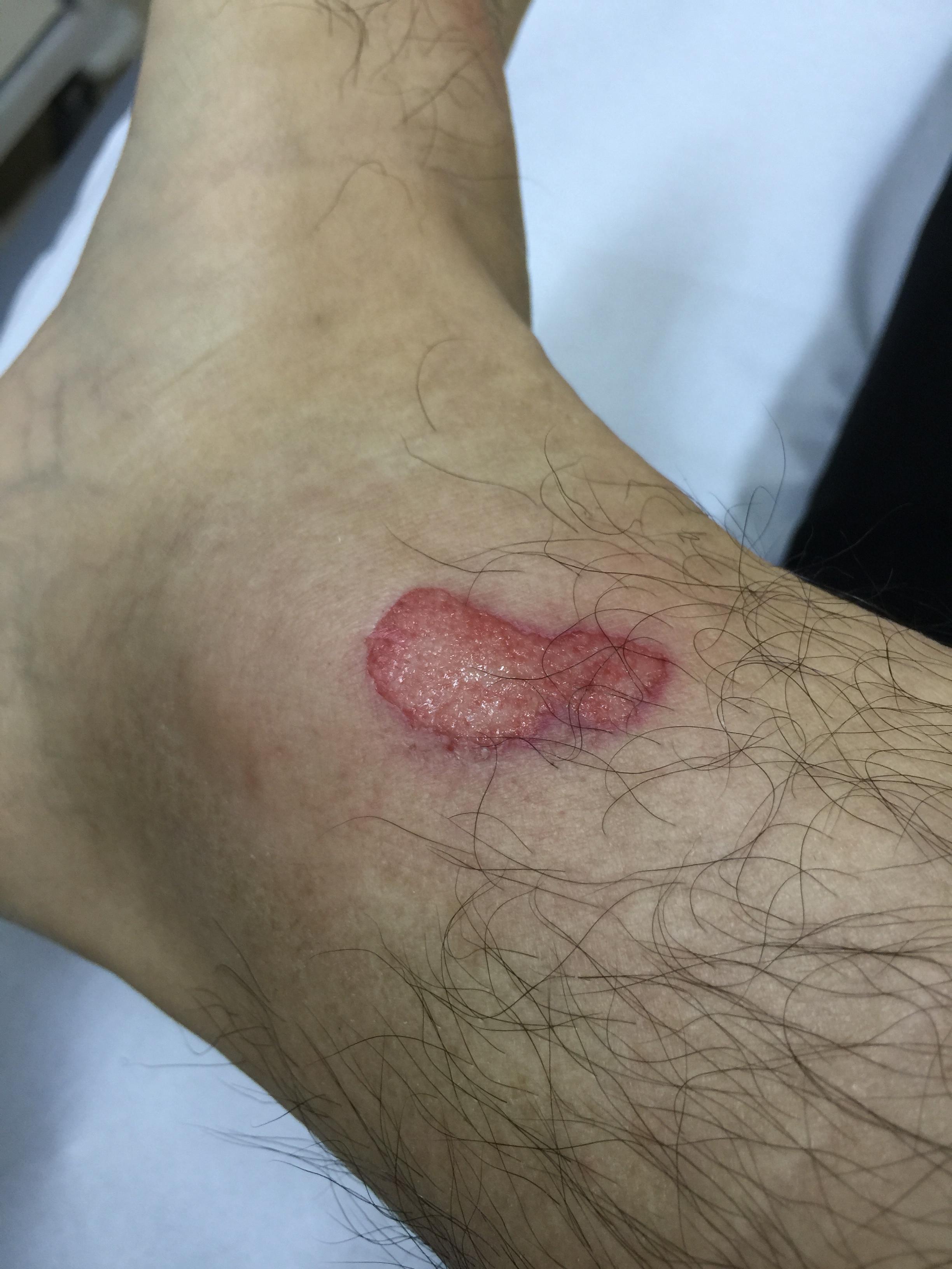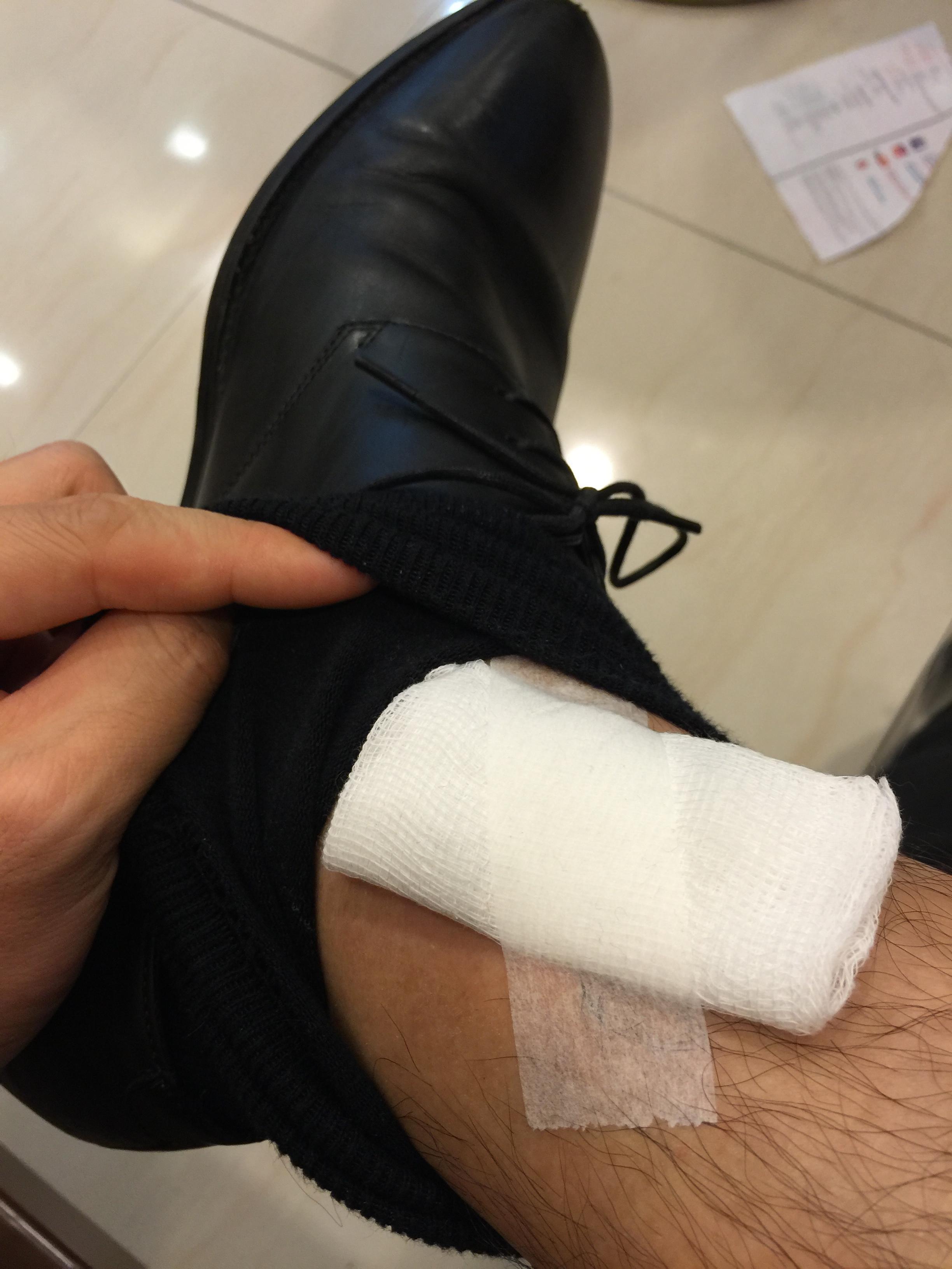 意外过程:7月31日,家中,一片直立的木块倒下,下意识的用脚去接。右脚脚踝部位被木块蹭去一块皮。看起来就是皮外伤,只是面积比较大。当时只是简单的贴上大片的创可贴。
