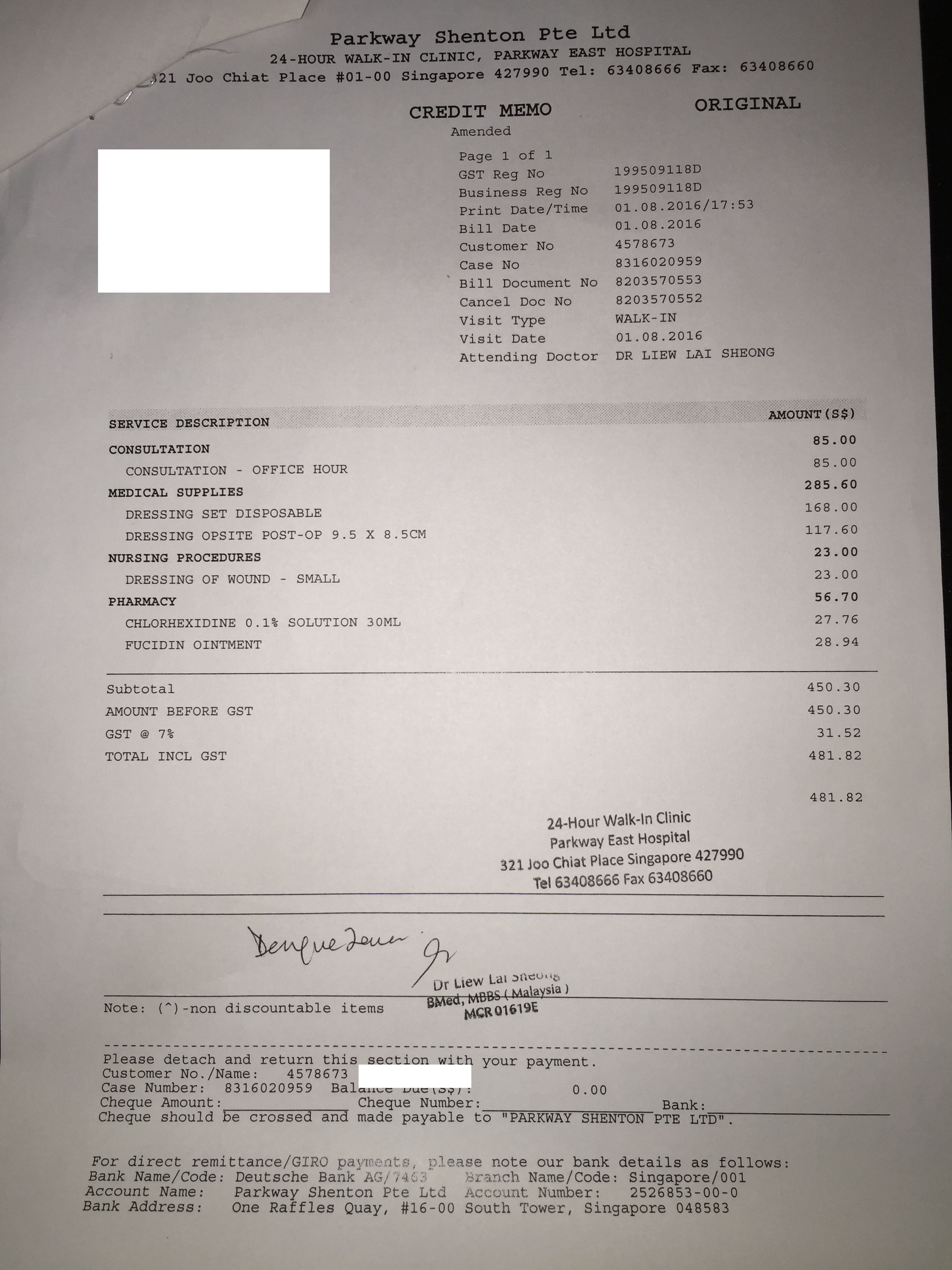 隔天,8月1日,照常上班。上午的时候开始感到伤处疼痛。本想着去附近的诊所简单的包扎一下。后来细想自己有保险可以cover意外伤,下午就直接去到自己家附近的私立医院, Parkway East Hospital。
