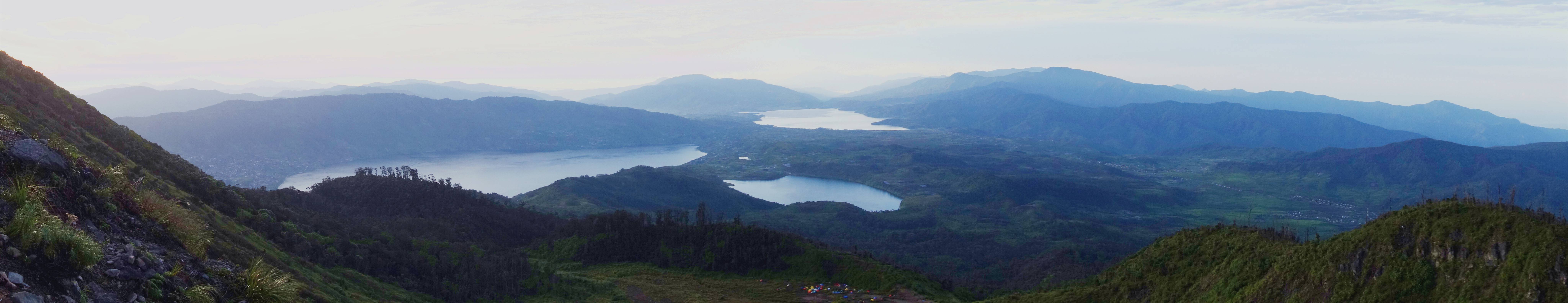 上山时往下回望,可以看到三个高山湖以及彩色帐篷占据的营地