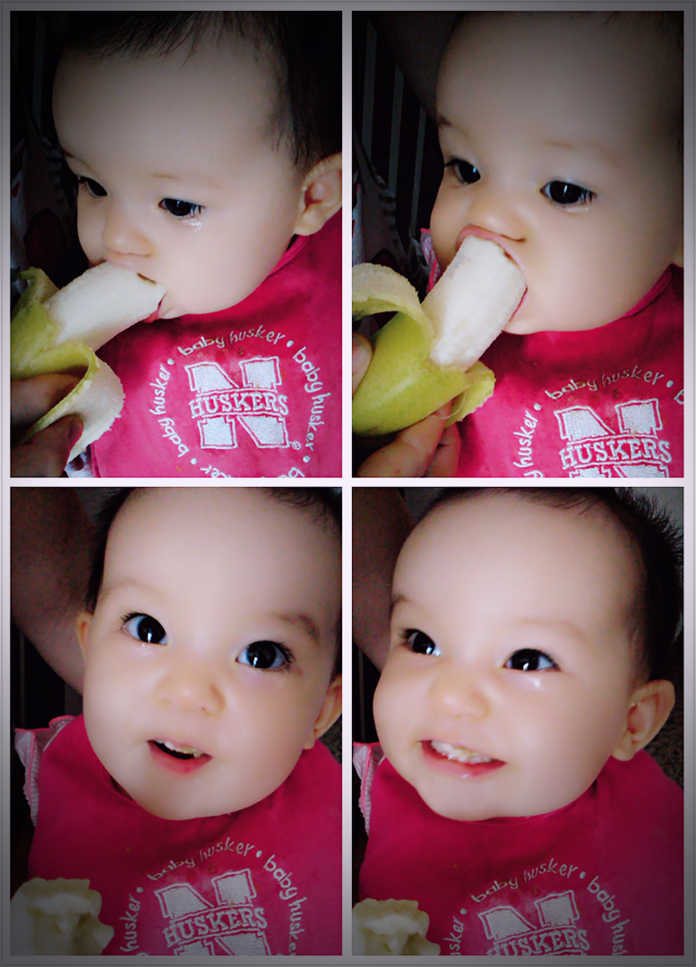 如今丫头每顿都要吃一大碗,连难吃的青菜碎都吃得津津有味,前段时间麻麻买了好多香蕉,吃货吃到满眼放光,有图有真相
