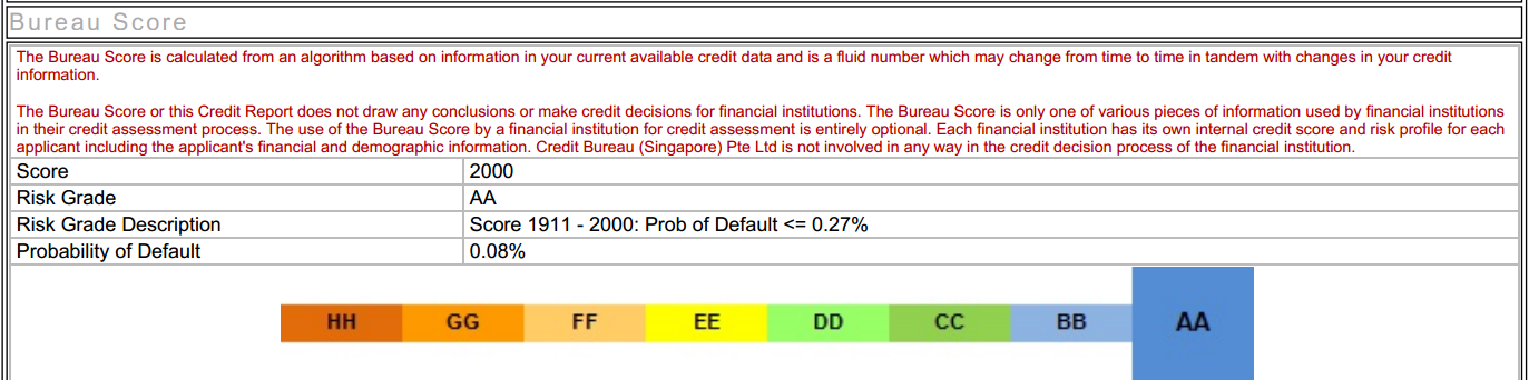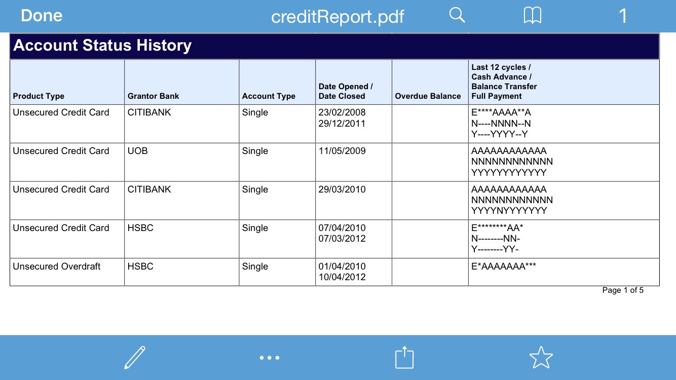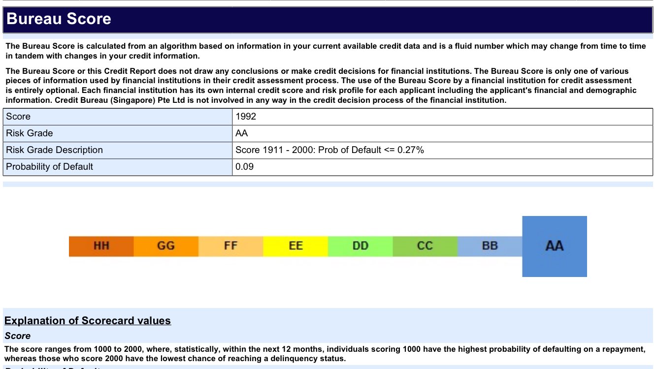 似乎很多人平时不看这个,最后贷款的时候有很多困惑。建议有要买房的人每年买一次CBR,不要像我的同事买房贷款时惊讶的发现自己是D。它长下面这个样子,你每个月的借贷行为(包括信用卡,房贷,车贷等等都算)都会在里面。一旦没有按时还款分数就会下降。之前很多人问我有30张信用卡会不会影响分数,答案是按时还款就不会,至少我还没见过分比我高的,大家可以买一下自己的PK一下。