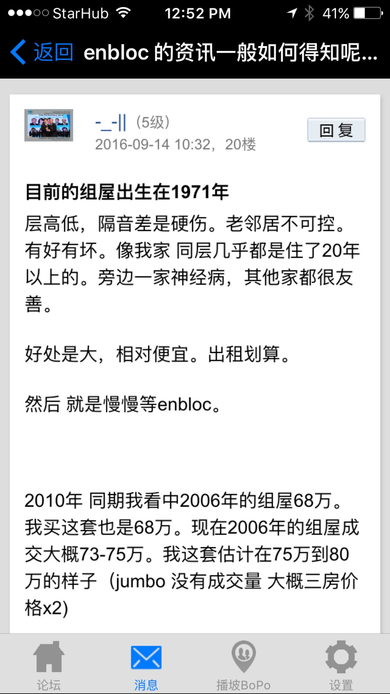 bbsid • • 45206 次浏览几个本版的中介陆陆续续自爆了近几年的自己的买房情况,像今天刚爆的2010年68万买入组屋,到现在价格在7,80万。从房产投资收益看,中介的自己的房子收益不是很好,所以其实问他们房子情况是可以的,他们的本职工作嘛,至于说会不会涨,哪里涨得更多,这个我觉得还是要自己做些功课。就像股评专家,如果自己投资赚了大钱,还用得着去当股评吗。相比较而言,一些非中介的资深人士,投资眼光非常好。本版几个大户就是这样。