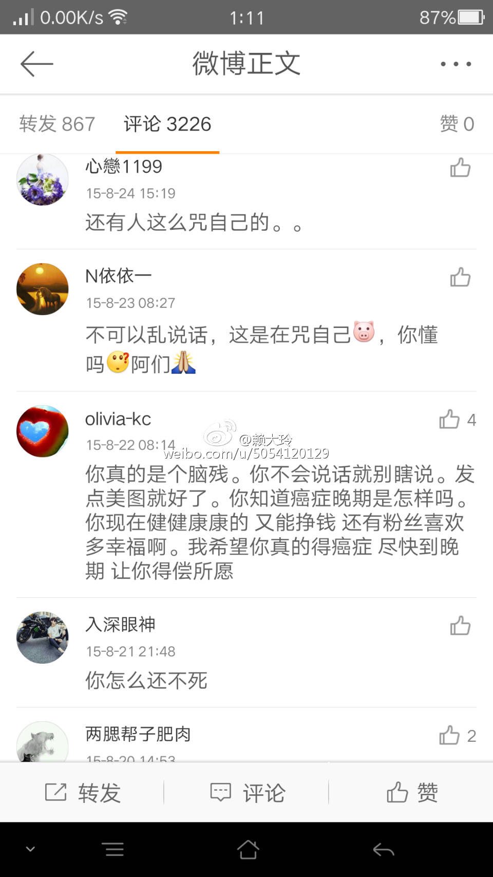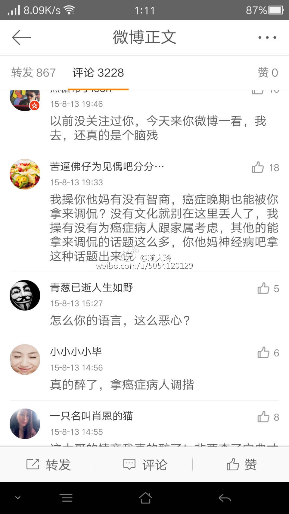 这些评论的起因也只是因为他发了一条这个虽然提到癌症病人可能是戳到一些人 但也不至于要说成这样吧