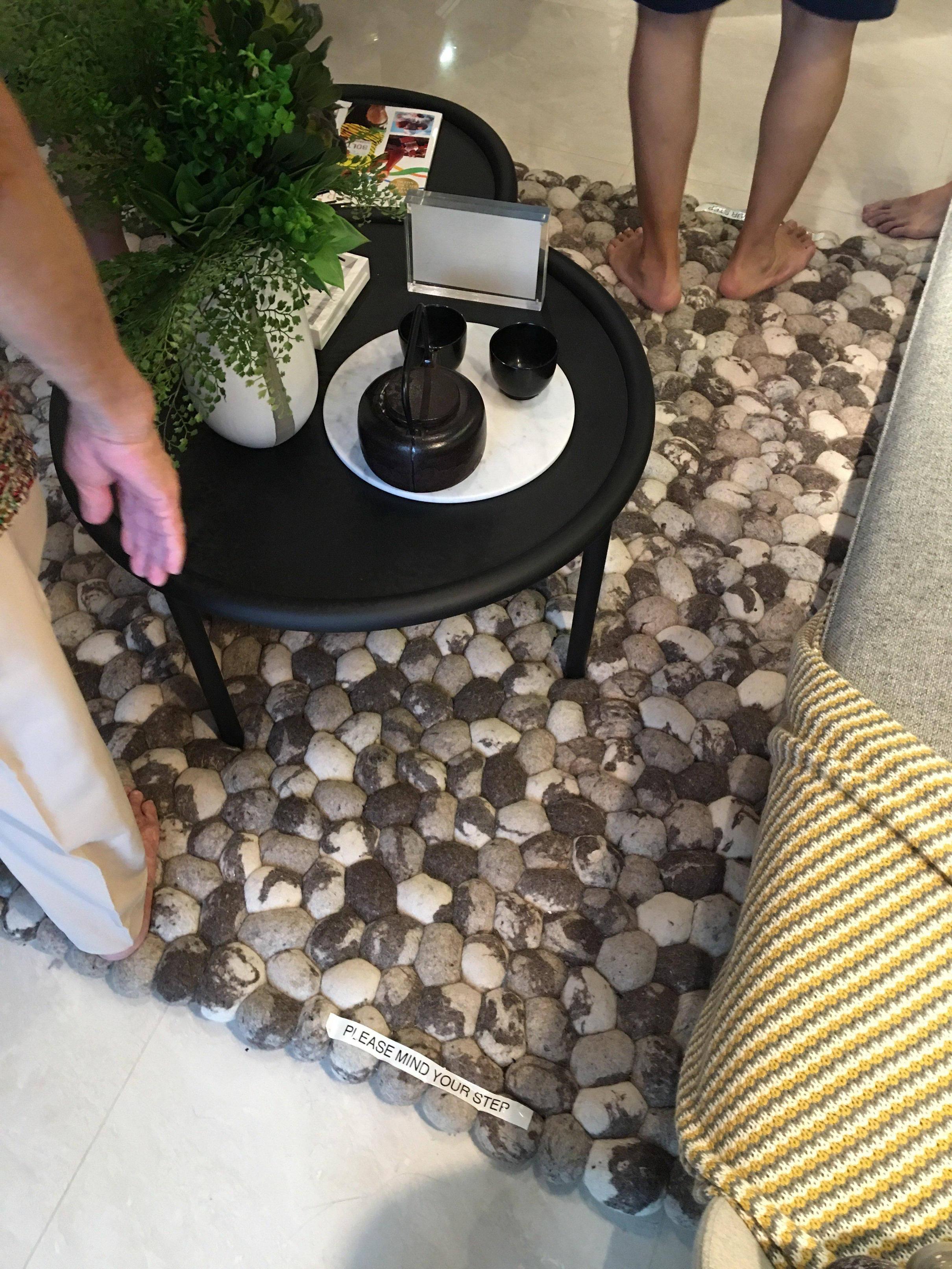 面积不大不过墙壁随处可见托板增加不少放闲置的空间鹅卵石风格的茶几地毯貌似还比较愉悦