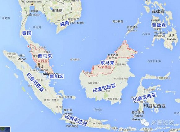 如图所示,马来西亚隔海分成了两个部分,但目前整个马来西亚的发展还是集中在西半部,东半部还是比较落后。