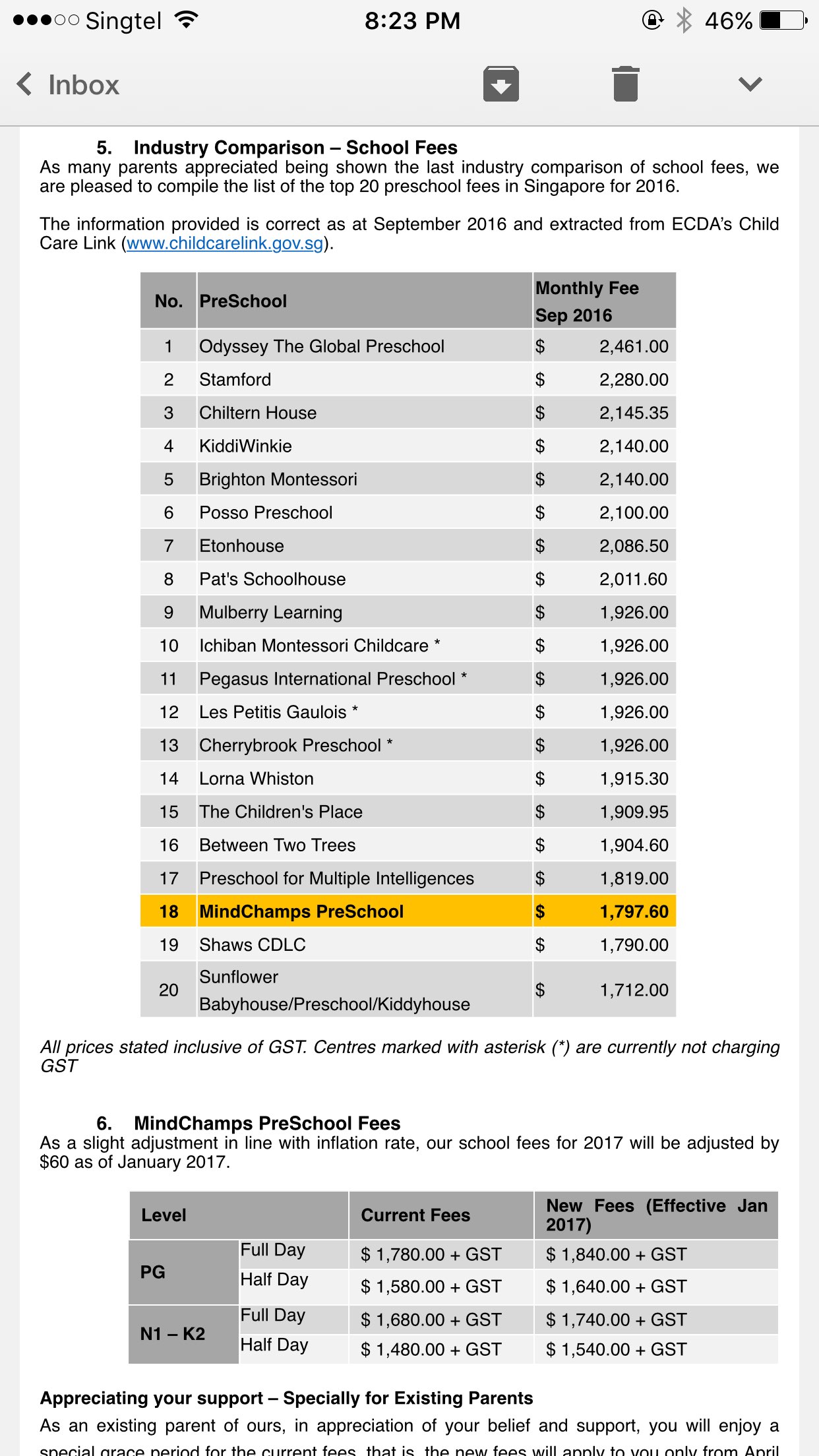 刚刚收到幼儿园邮件,各家学费比较,给麻麻们参考mindchamps17年涨价60块每月