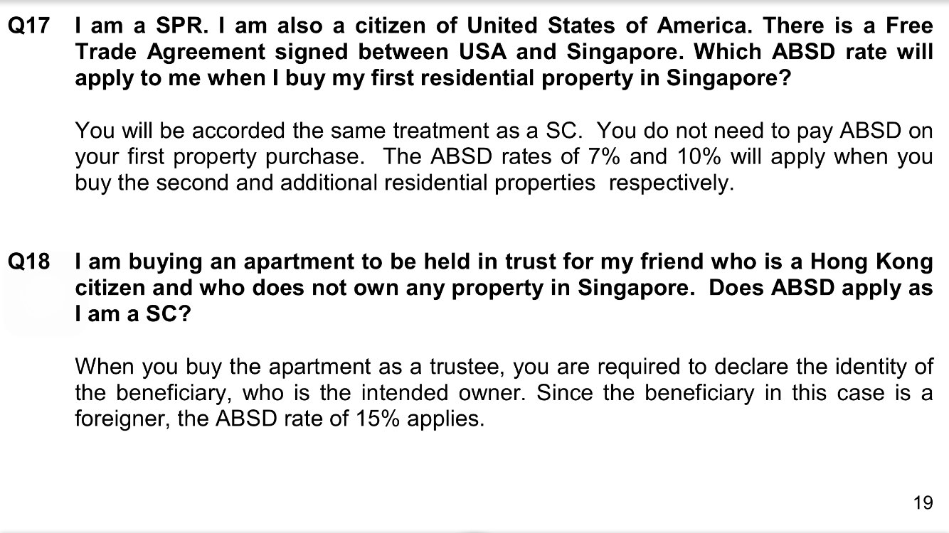 3. ABSD看trustee身份,如果孩子是PR或外国人,ABSD依然有。孩子是公民则无ABSD。如果一次买多套房产做trust是否有ABSD我忘了问,以我个人理解应该是有的。