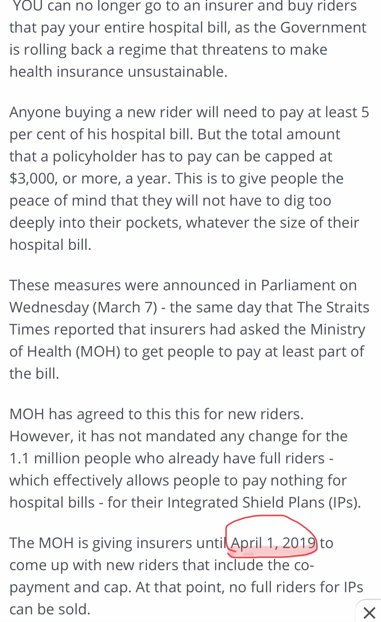 Chloe410 • • 23273 次浏览根据新加坡卫生局,也就是MOH(Minintry Of Health)规定,2019年4月1号之后,新加坡市场上不再有100% coverage的住院保险。