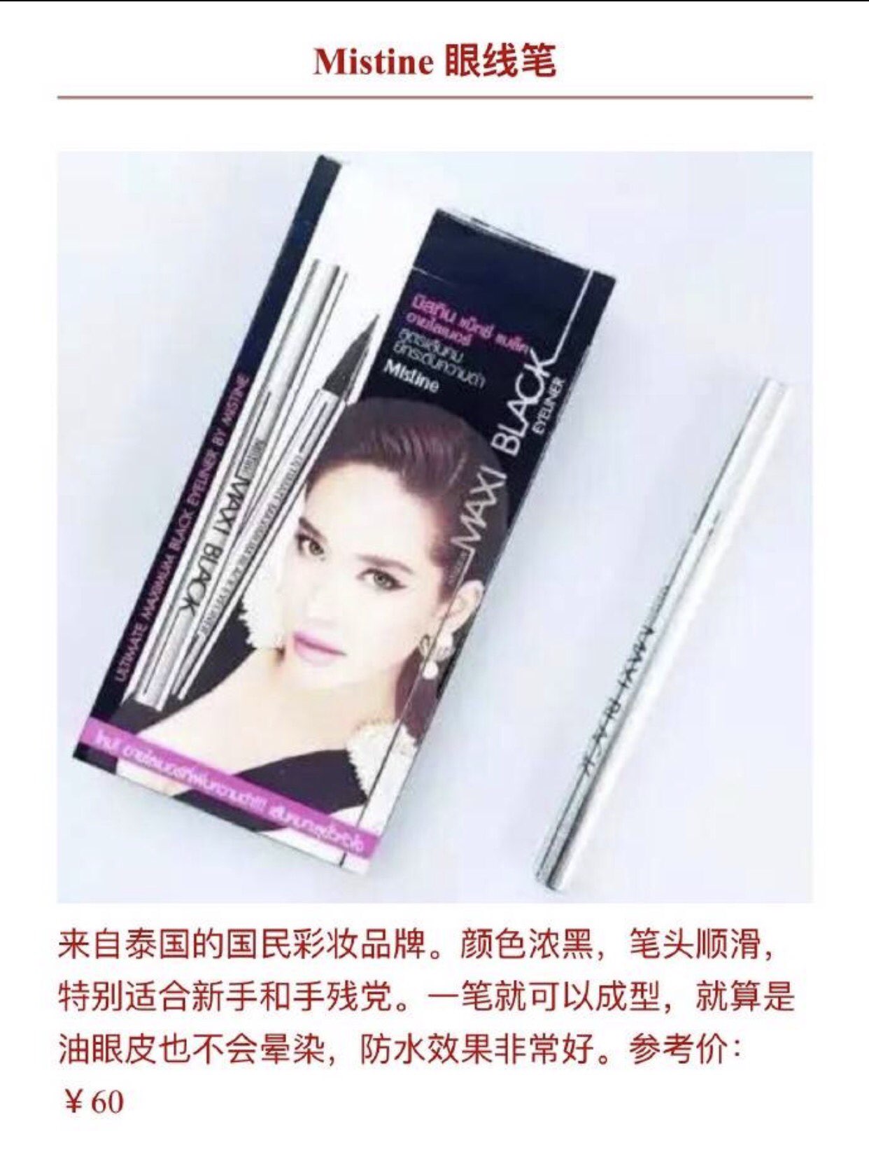 Mistine眼线笔泰国出产,看微博介绍,入手一支。我的脸也是偏油性,用了几支别的牌子都晕开,这支不但不会晕,而且也比较好用。价格也很平民,10块左右,值得入手。不知道本地有没卖,我是在泰国买的。