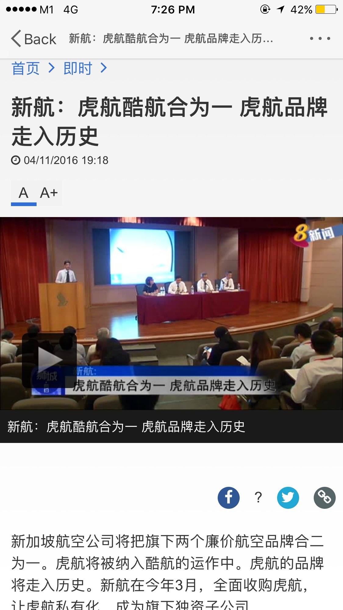 新航今天在季度业绩报告上,做出上述宣布时也指出,整合将让虎航和酷航充分实现成本和收益协同效应。两家廉价航空将完全合并,共用航空营运许可证和酷航的品牌。新航认为,这能为两家廉航提供增长机遇和更无缝衔接的旅游体验。鉴于运营、商业和监管考量,两家航空公司最快将在明年中,融为一体。