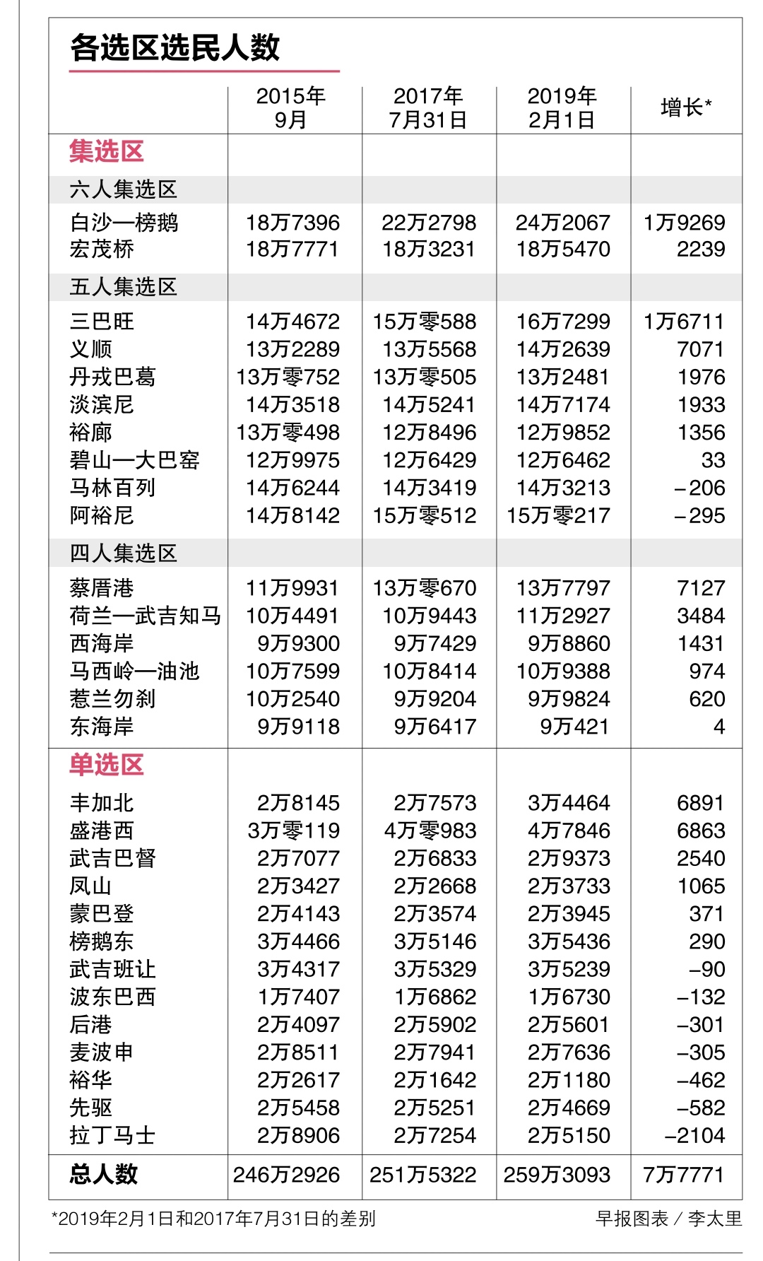 李显龙总理前天(4月1日)以书面方式回答同为宏茂桥集选区议员颜添宝的询问时,透露16个集选区和13个单选区在过去近两年的选民人数变化。合格选民人数增加最多的,是以副总理兼国家安全统筹部长张志贤挂帅的白沙-榜鹅集选区。从上一次核实选民人数,即2017年7月31日,至今年2月1日,这个集选区选民人数增加了1万9269个。
