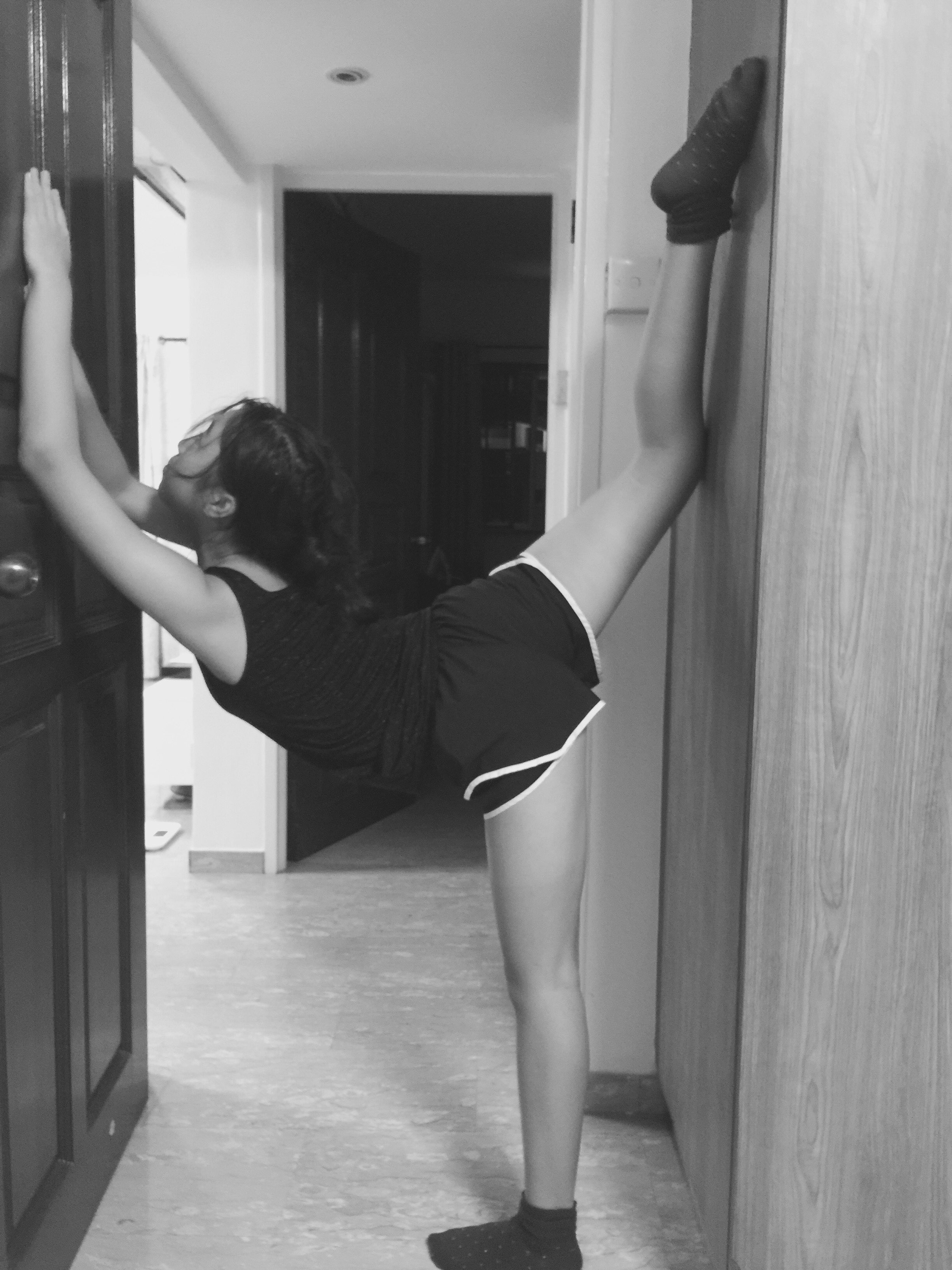 她说:“挥洒汗水,收获青春.” 陪我练了一下拉背,她又说:“我知道你基础薄弱,但是没想到那么薄弱。你要好好练啊,要不然以后一摔就会挂呀,我真是很担心你呢!”她拉伸的照片,
