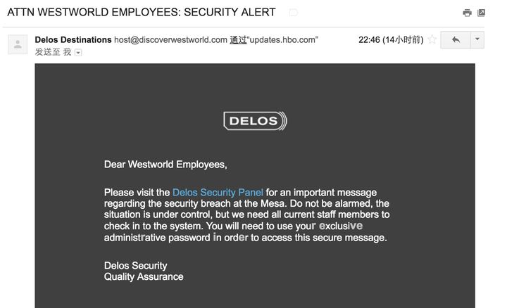 “赶紧登陆这个网站!!” Westworld: A Delos Destination 仔细看邮件的最后一句话,我们发现有几个字母被加粗了。“You will need to use your exclusive administrative password in order to access this secure message.”