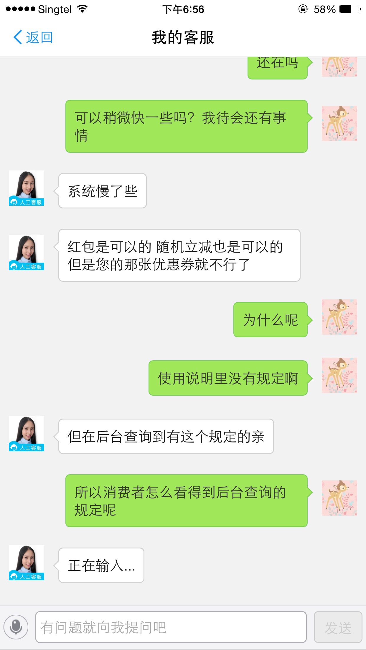 然后我就开始了漫漫维权路,然而并没有什么用,客服的回答是说什么后台有什么消费者看不到的规定专门坑我们的,这我就不乐意了啊,为啥要放后台不告诉我们呢?然后就一句超过了我的权限处理不了,然后打电话联系客服也没有回音