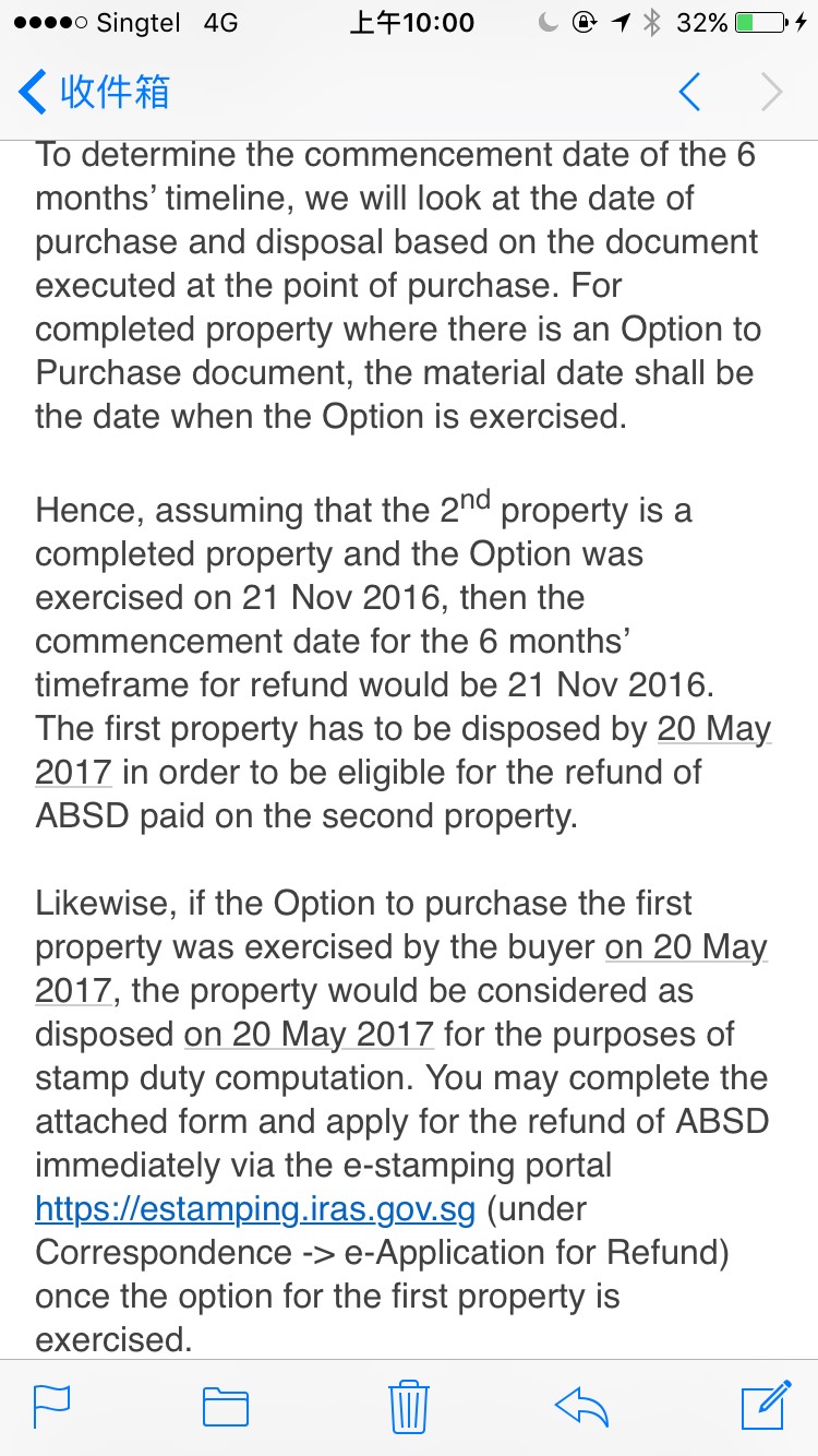 我是邮件询问买二套房后必须6个月内卖掉一套房才能申请退回absd,这6个月时间的首尾如何界定。