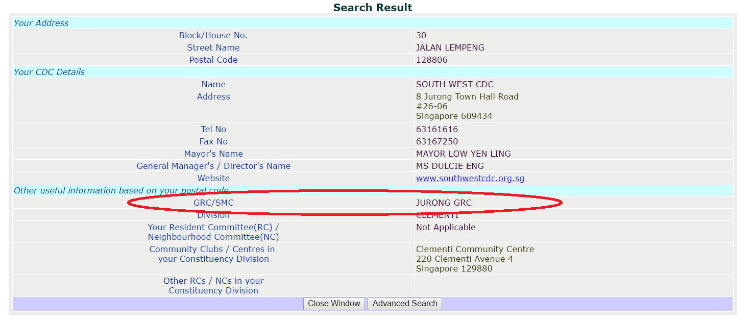 最重要的是GRC/SMC,如上图,南华属于Jurong GRC。如果是输入的HDB地址,RC那边会显示你如果报名RC义工会服务的RC,至于NC我试过几次都是NA,可能信息不全。