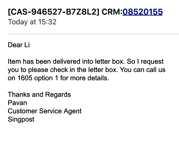 昨天特意把同楼层的信箱都“偷看了”一遍,结果就真的在别人的信箱里看到了我的包裹(我看到上面的地址了)。还没来得急给singpost打电话,今天就收到了这样一封邮件。