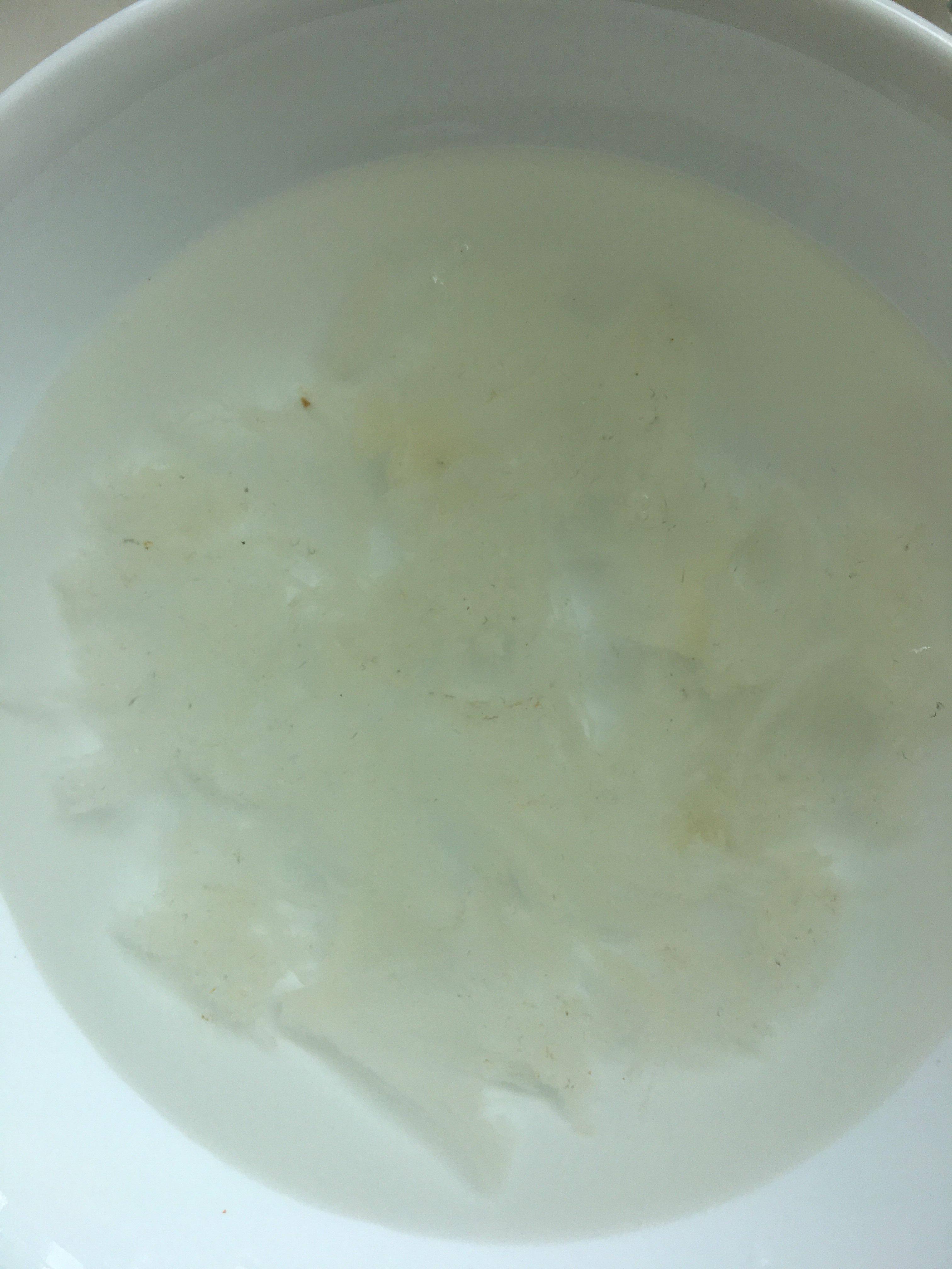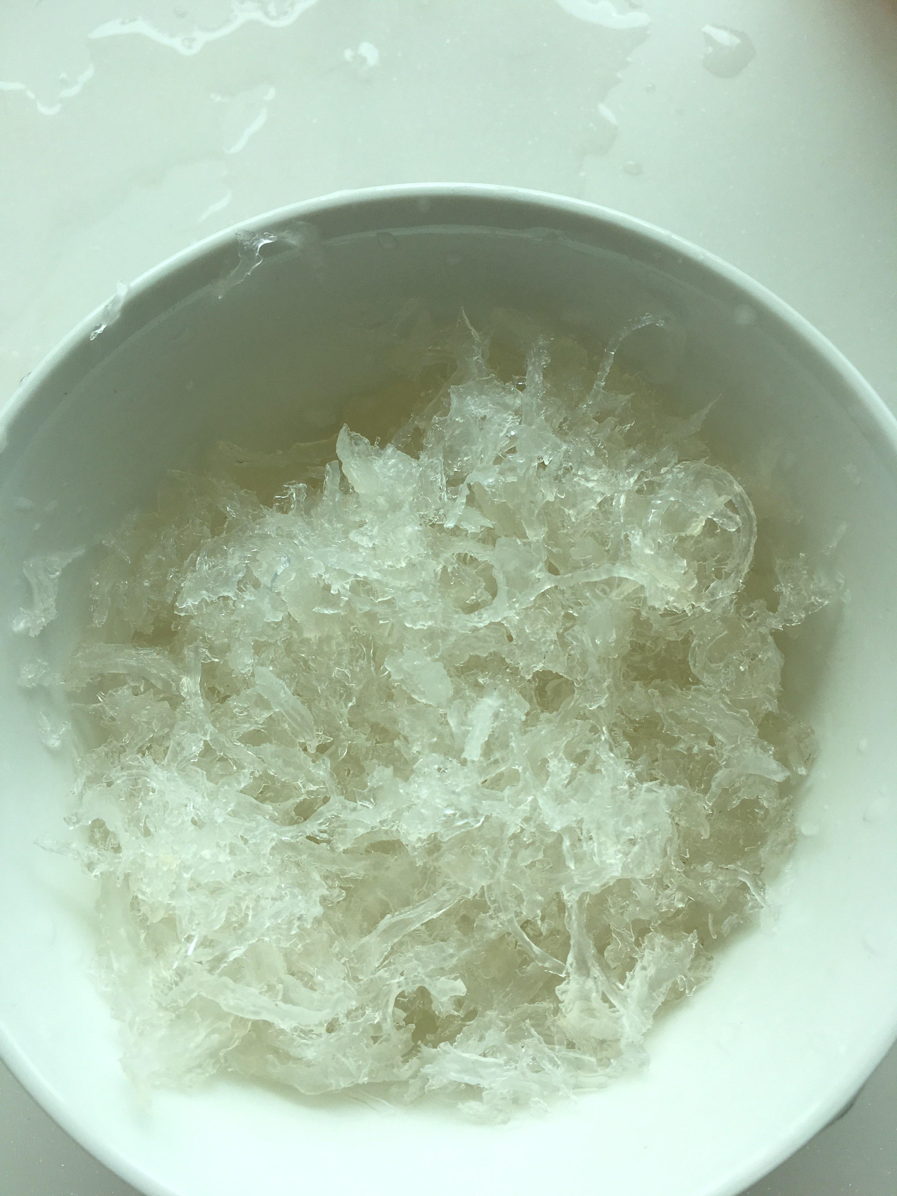 后来我把燕窝泡了一整夜。第二天起来把它撕成小碎条… 放在水里晃一晃… 竟没有什么毛了。