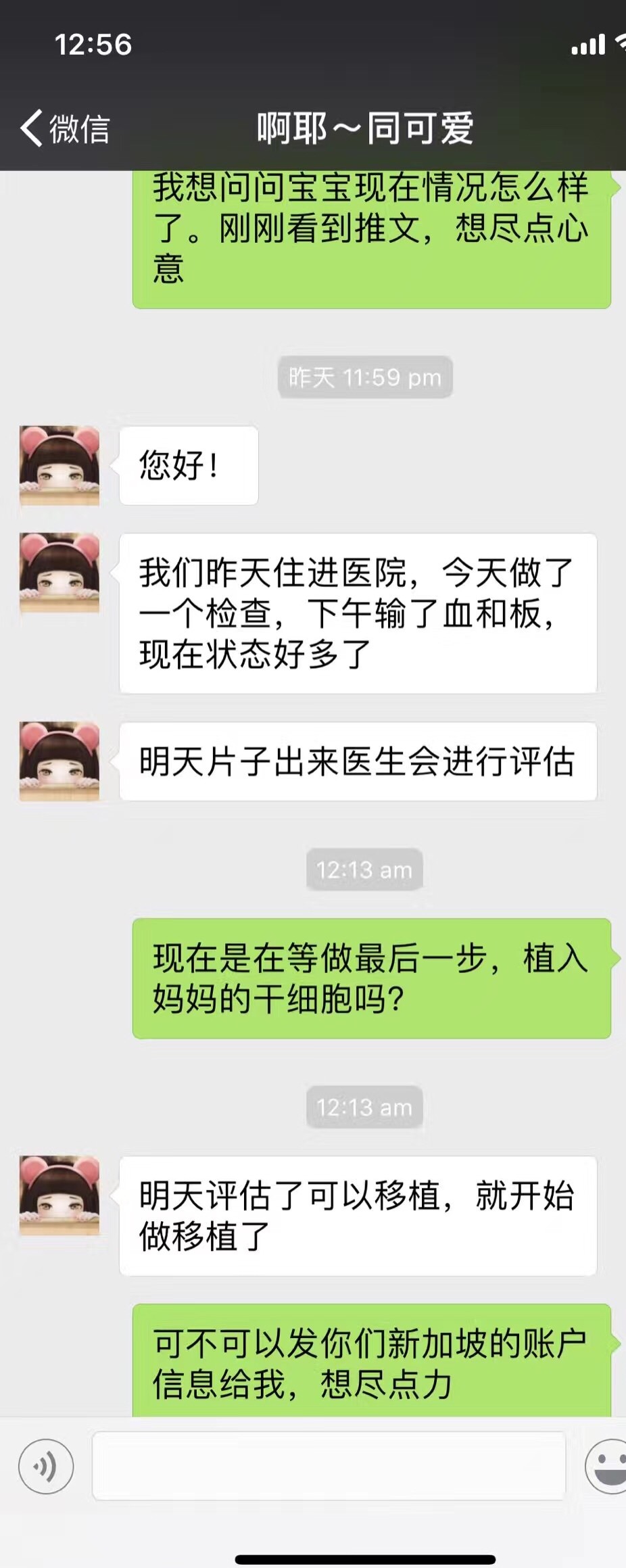 为了省钱,我们曾尝试联系中国几家专业治疗儿童肿瘤的医院,可得到的回复是目前国内没有一家医院有为神母孩子做异体移植的经验。同时,因为同同血象低免疫力几乎等于零,孩子现在根本无法离开新加坡! -