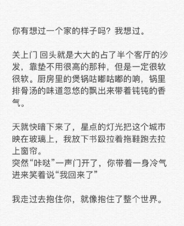 突然 咔哒一声门开了我幸福的冲劲你的怀里,你却飞奔着跑去厨房,说亲爱的,汤烧干了。 嘿嘿