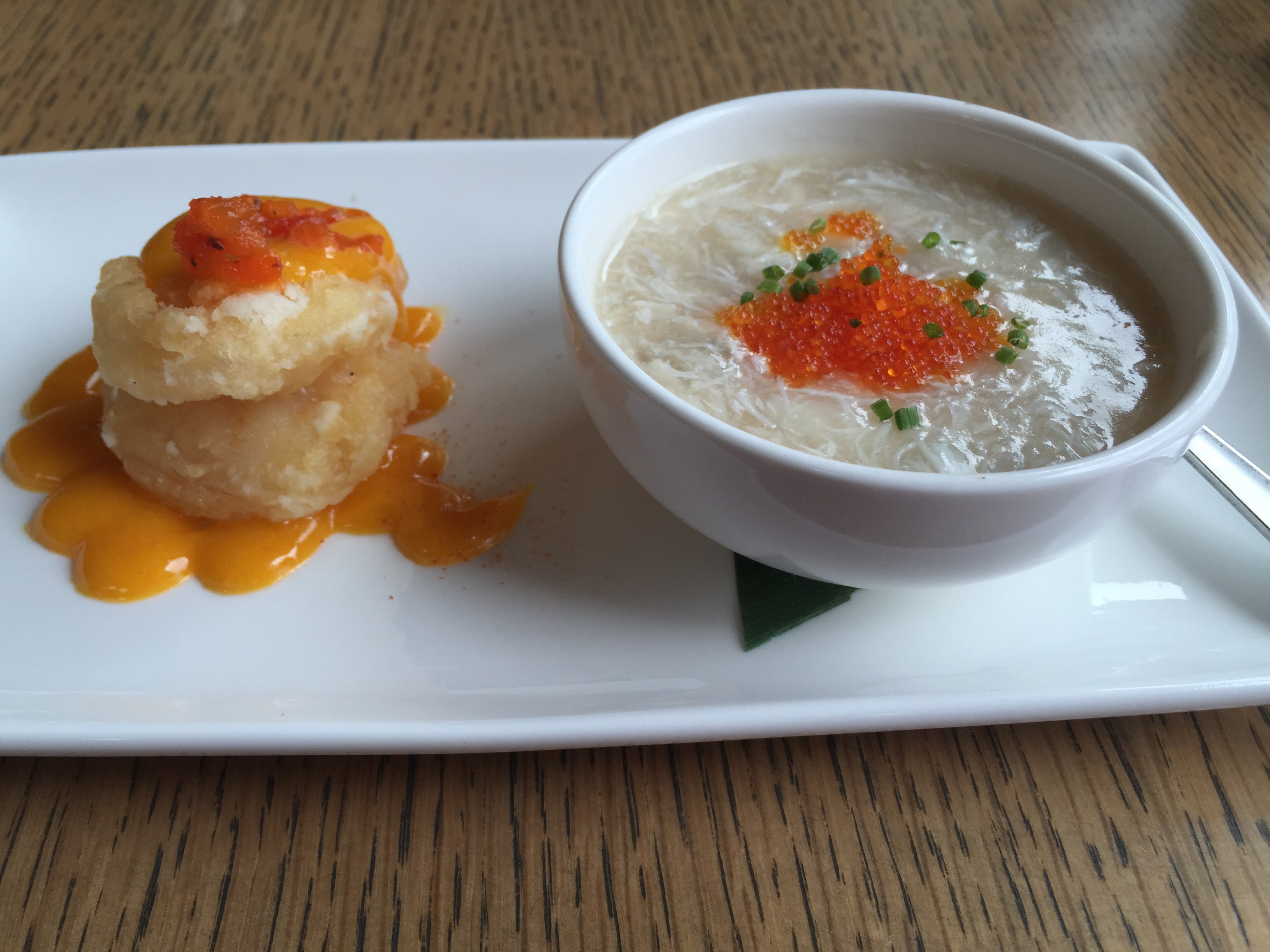 开胃菜留下深刻印象的只有这虾球和蒸蛋了虾是裹了咸蛋黄炸过的,然后涂上了蜜汁调料,感觉口味还不错,酸酸甜甜咸咸鲜鲜的感觉,虾肉也比较q弹