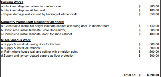 carpentry work没有列出尺寸,小心有坑。Misc的D项应该免费提供。