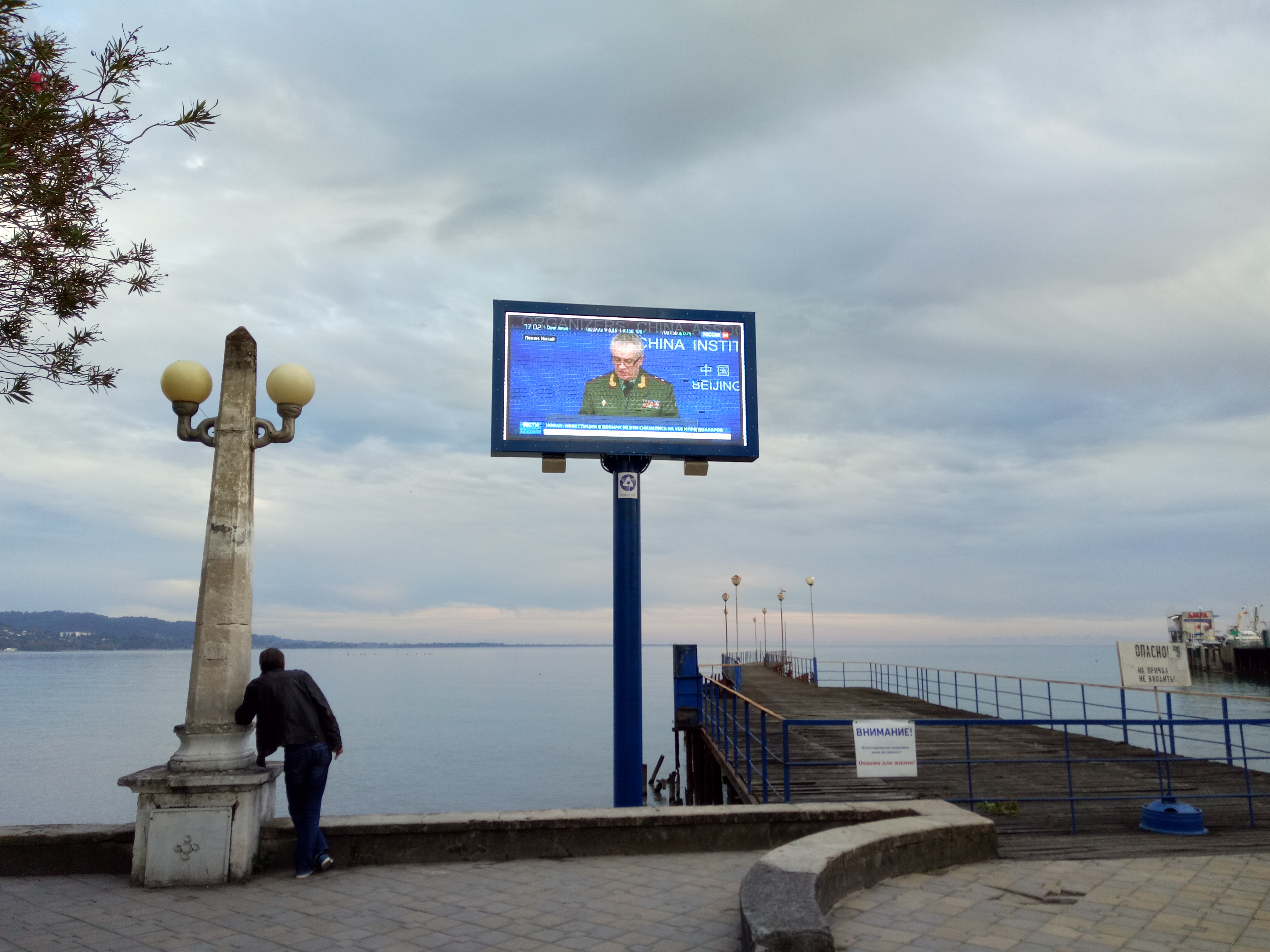 在海边广场有当地人,也有俄罗斯的游客。人们穿的轻便衣裳,和偶尔飞来的白色海鸟,一道在海风中起舞。这边是海,那边是人烟稀薄的小城。天地是那么的远,整个世界都那么远。但是海边矗立的电视屏幕还是为我们带来了巨型经济体 - 中国的消息。