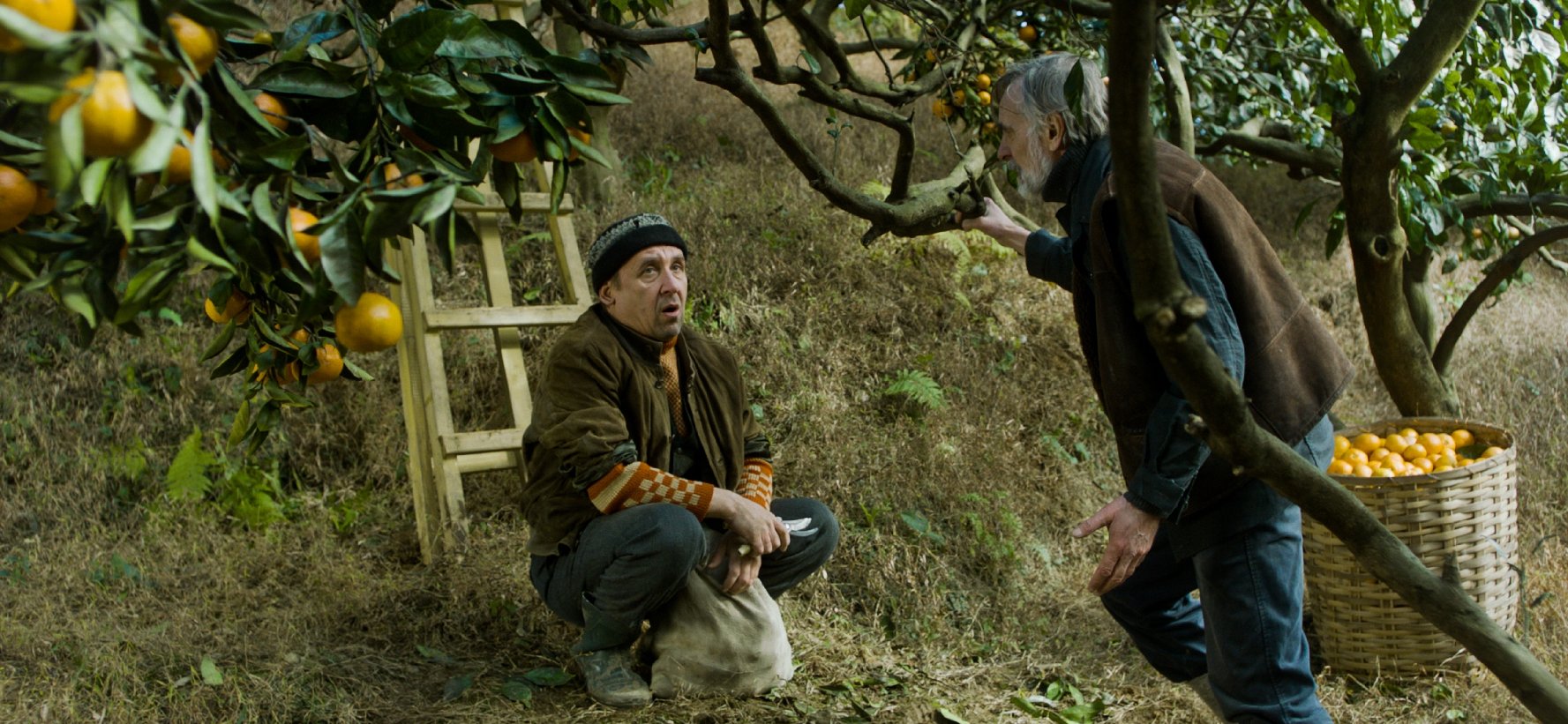 故事就在这样的大背景下开启。老头Ivo是居住在阿布哈兹的爱斯通尼亚人,拒绝离开战火纷飞的阿布哈兹。邻居Margus舍不得他心爱的柑桔园,也留守。车臣雇佣兵跟格鲁吉亚的军队在柑桔园附近交火,各自都伤亡惨重。老头跟邻居发现了三死一伤的车臣人,八个横尸当场的格鲁吉亚人,其中一个“死者”还有一丝生意。他们把两个伤兵拖回老头的家。