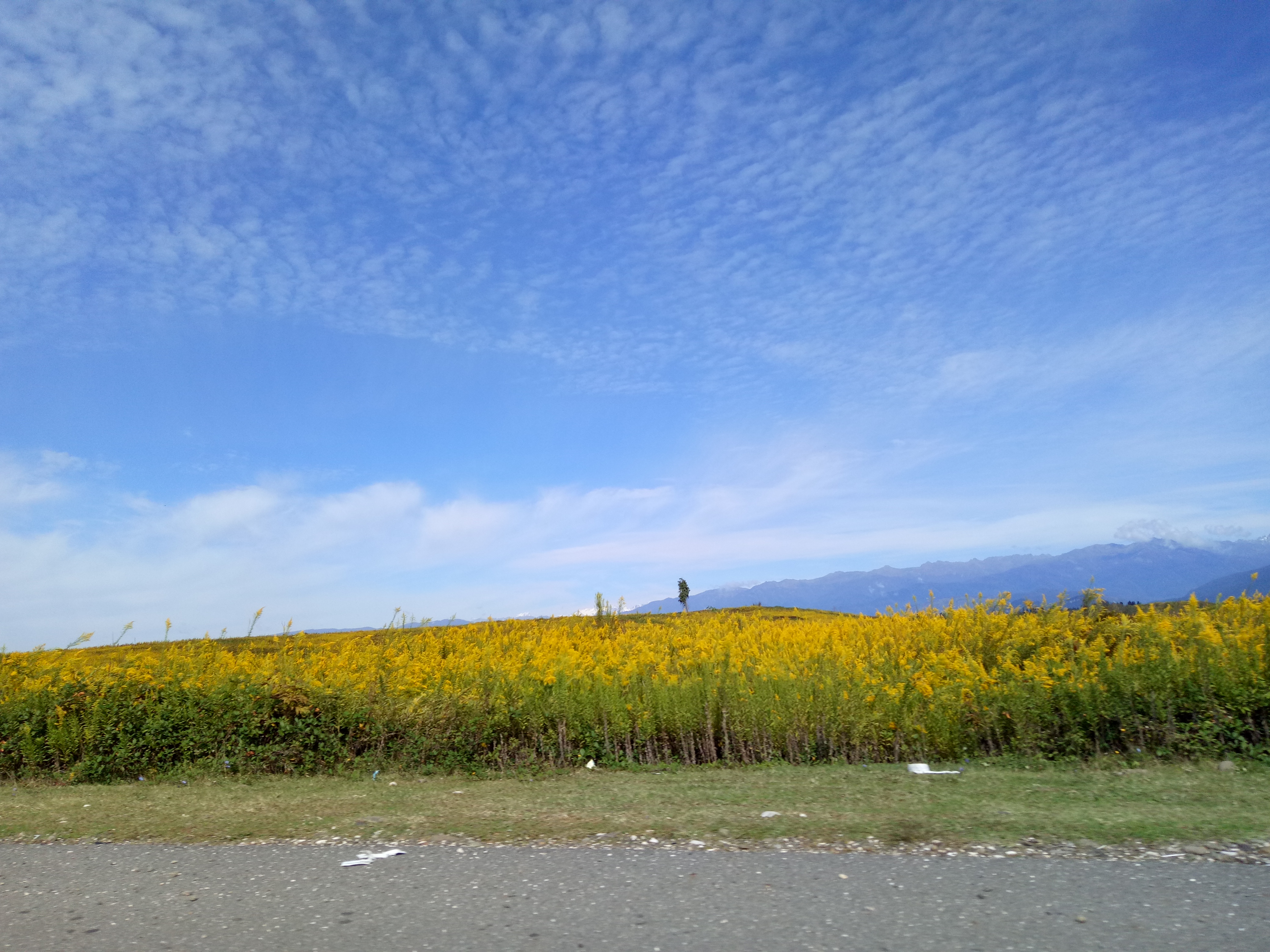 司机是个清曜的老人。摇头,笑。停下车,让我们把行李放在后备箱里。我们抱着一帽子的榛果,有些不可置信地傻笑。窗外是无尽的黄花的原野。最远处的天际线上,高加索山的雪峰正在闪耀。