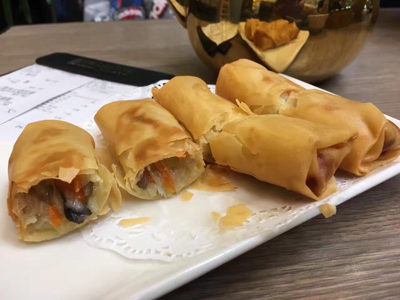 春卷好油,奶黄包里面居然有咸蛋黄还是面好吃。。。猪大骨熬的汤。。
