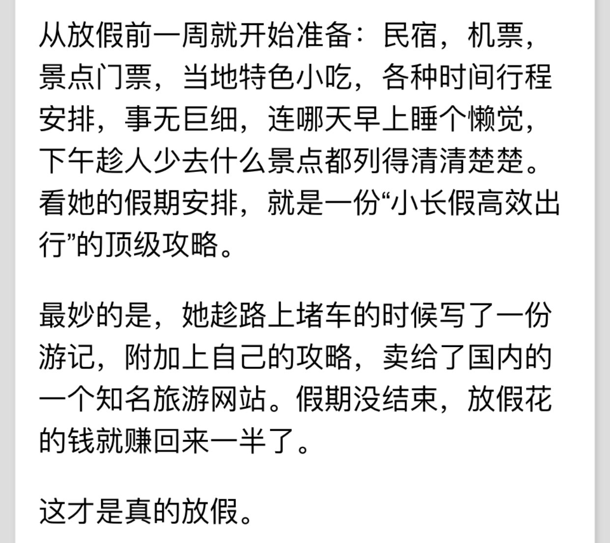 最妙的是,她趁路上堵车的时候写了一份游记,附加上自己的攻略,卖给了国内的一个知名旅游网站。假期没结束,放假花的钱就赚回来一半了。