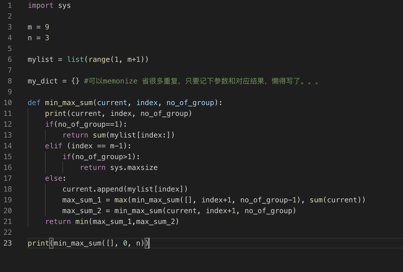 max_sum_1 = max(min_max_sum([], index+1, no_of_group-1), sum(current))