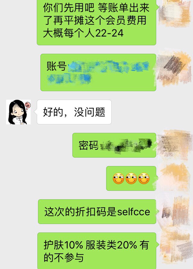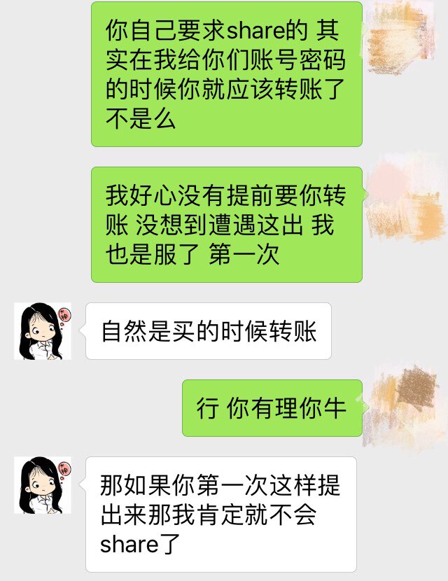 继续事情发展,我在微信建了群把账号密码发了出来,那会儿秉持着契约精神,并没有着急要大家转share的会员费,毕竟这几年在版上接触的妹纸也不少了,基本上都挺好的没什么drama。之后这位妹子觉得黑五折扣不好没什么想买的,等圣诞再看看。我想想也是吧,反正大家一起买买买开心就好了。这之间我有问过妹子确定要share么,她信誓旦旦的说一定会买的,于是我就陪着等。