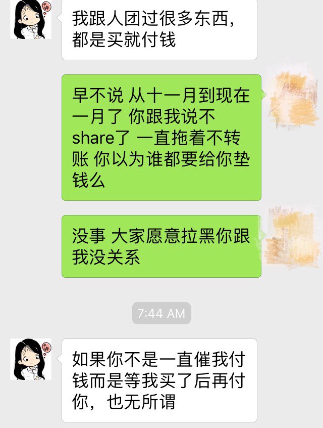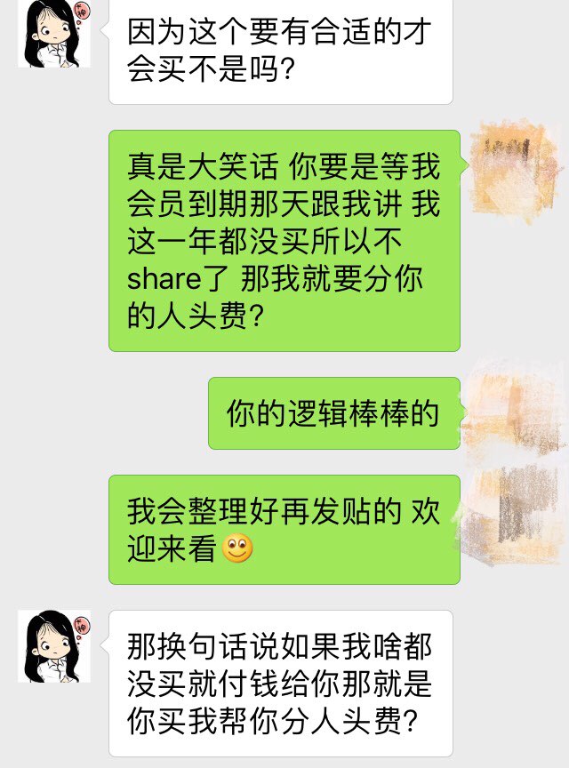 继续聊天内容,被我戳穿之后,她争辩到自己并未下单所以不用转会员费。(我一脸懵b。这话你干嘛不早说,之前问了多少次都笃定的说一定会买的估计是我梦里的那个人吧!)然后告诉我让我去找别人share,我也是服气了,说的真是好有道理啊,我竟无言以对,占着坑两个月的是谁啊,有这个时间我早找到同样恪守信用的妹纸了好吗,真是浪费时间。