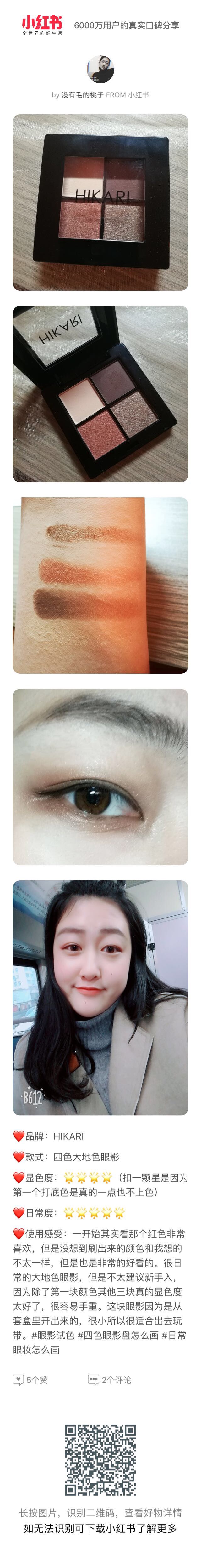1. 满100新币送Hikari四色眼影Hikari四色眼影,来自LF,全新有盒,红棕大地色?我拍的太失真了,就从小红书找了一个功课