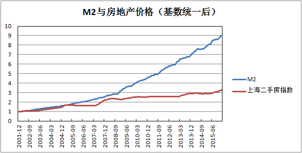 对,房价。中国的房地产价格不计入CPI,虽然只有平均每年3%的总货币超发,但是这是按总M2同比计的,按目前的M2总量,那就是每年约四万亿的规模。在CPI温和上行的背景下,扣除地段因素和数据修正因素(07年之后,你们懂的),中国核心区域房价同比增速过去十五年基本上与M2增速持平,因此中国的房子更多体现的是类似黄金的货币属性,而不是类似白菜的必用消费品属性。