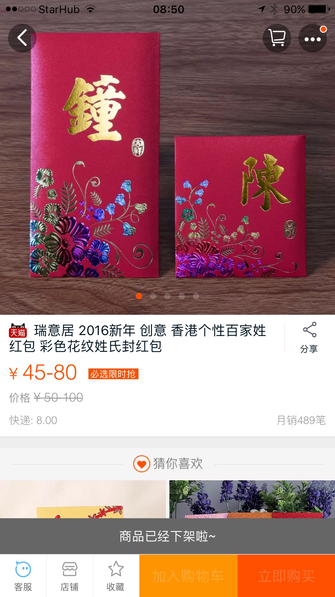 刚收到的这个定制的红包袋可惜下架了,有需要的朋友明年提早下手吧……设计不错,质感很赞,如果姓氏特别点儿的还是挺好的~~缺点就是字体没得选,我的姓印出来没有很好看……