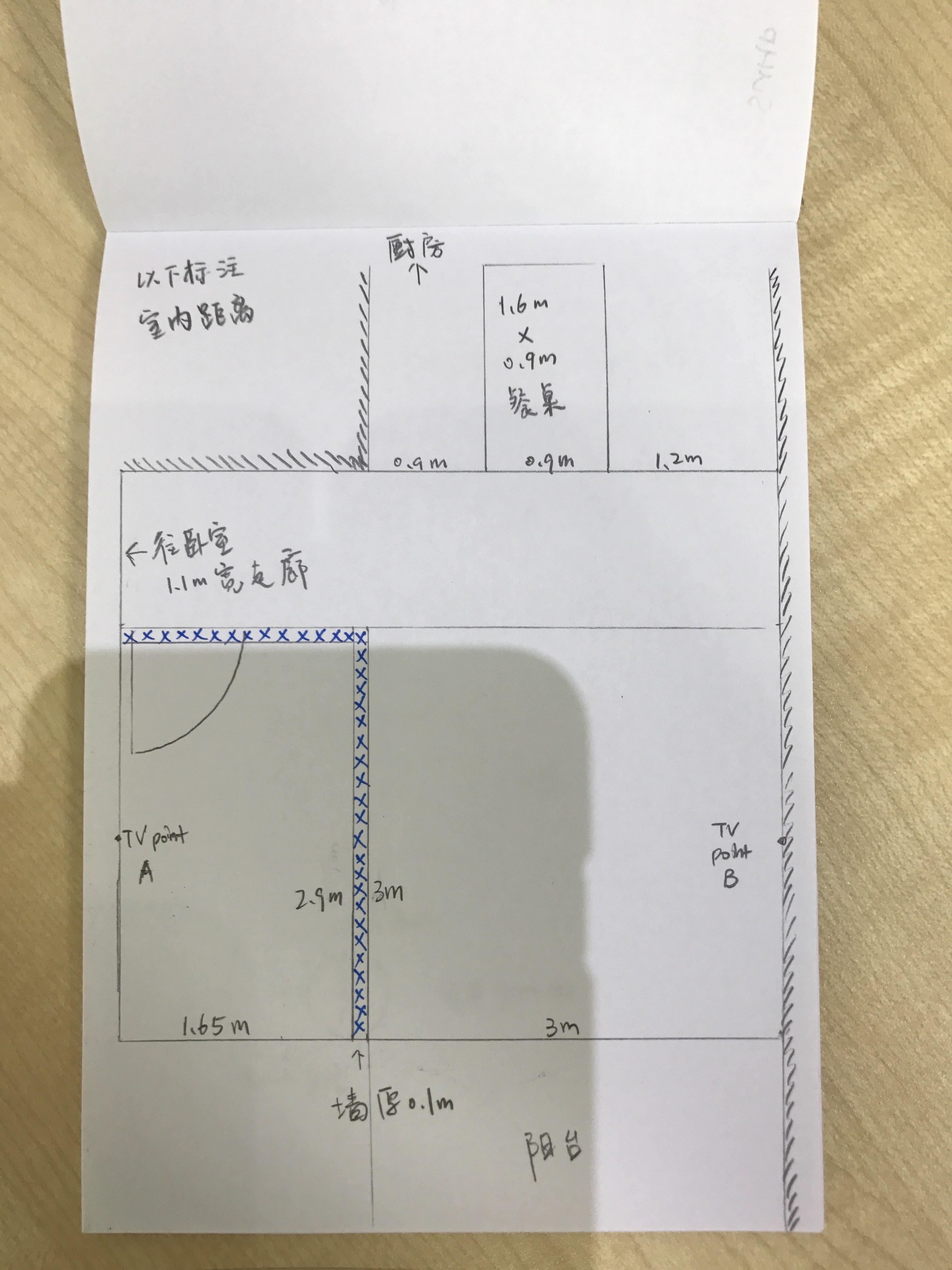 突破后大勾手 • • 42084 次浏览不想暴露太多个人信息,所以自己手绘了个挫挫的客厅图。现在客厅比较小,三米开间(室内实测距离)。家具是圣诞打折的时候买的,有些说好了可以退,随后将附上家具尺寸图。楼主觉得边上那个1.65m宽的小房间造成了冗长的走廊和开门空间的面积浪费,考虑是不是打掉它。但家具是按照不打墙的设计定下的。打掉墙以后由于TV point的限制,电视墙只能是左右两面之一,4.7m观看距离太远了。楼主只打算买49或55寸的电视。请大家支支招我这些家具要怎么塞?
