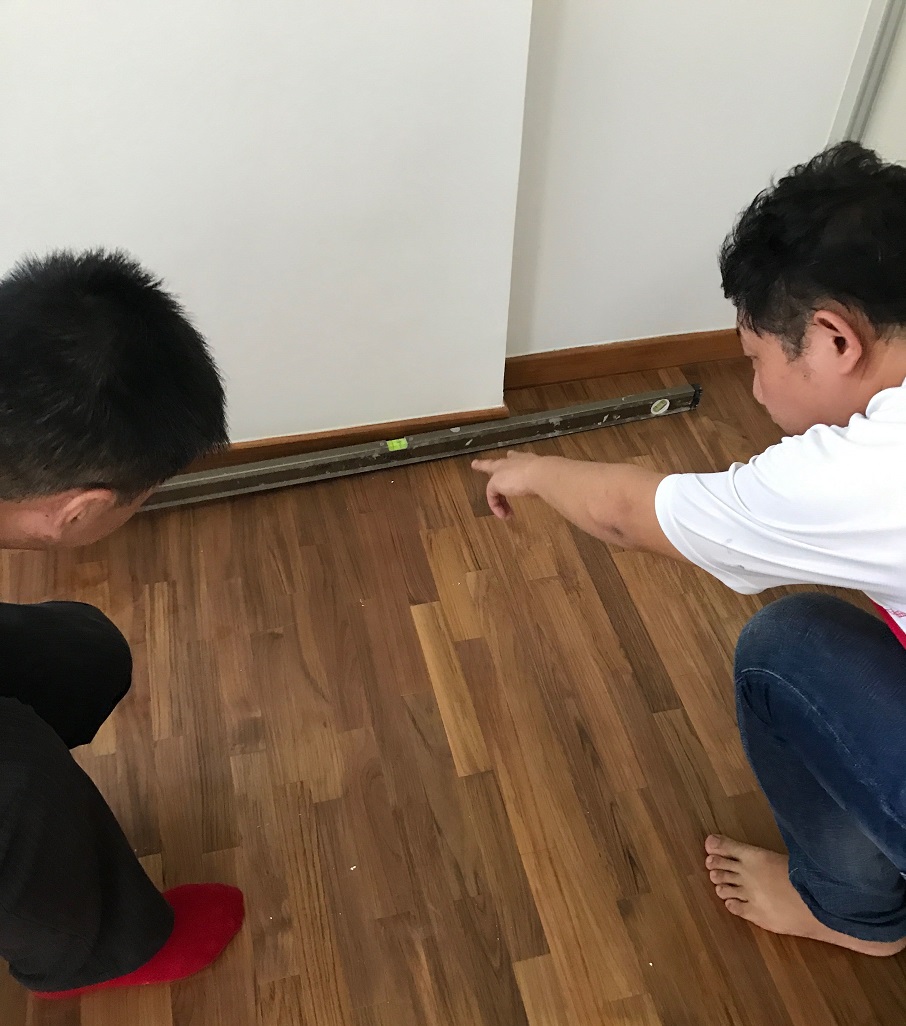 4 复合木地板就比较耐操,无胶,搭扣扣上就行,且在新加坡不需要打龙骨。所以没有太多可检查的,只要铺平整了铺密实了,没有外伤,基本就没问题。