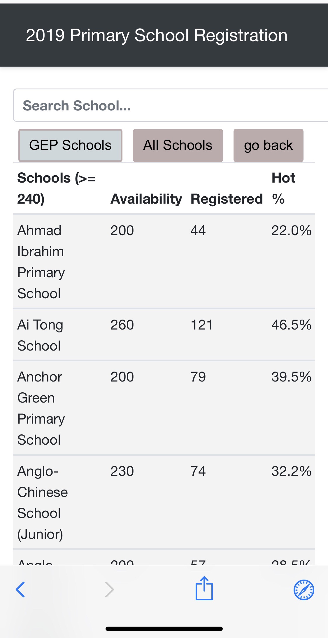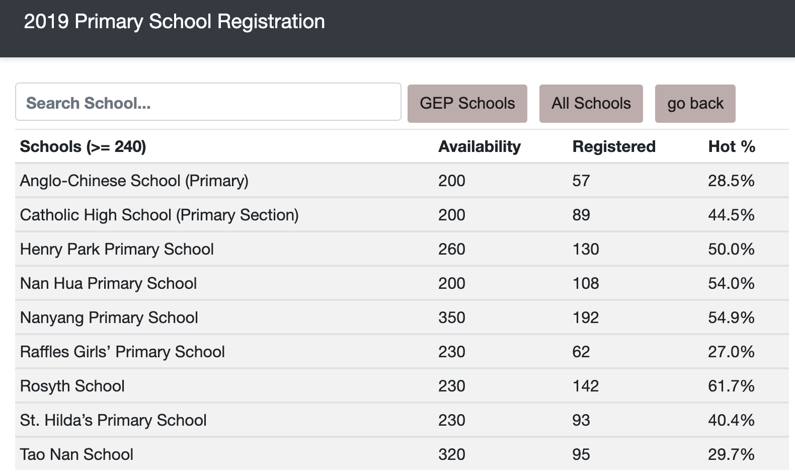 以后会第一时间更新每一阶段的原始报名数据,更新时间基本上就是每天晚上8点。现在就点击下面的Phase 1 button就行,其他阶段数据没有,另外我只显示了学校招收名额在240以上的学校,请原谅我过滤掉了小学校,不过240以上就涵盖了所有的GEP学校了,点击GEP button就能只留下GEP学校看。