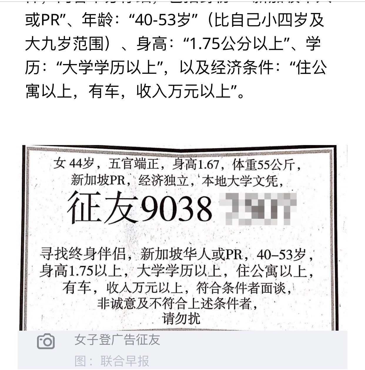 广告下方也仔细列明了寻求“终身伴侣”的条件,内容十分仔细,包括身份:“新加坡华人或PR”、年龄:“40-53岁”(比自己小四岁及大九岁范围)、身高:“1.75公分以上”、学历:“大学学历以上”,以及经济条件:“住公寓以上,有车,收入万元以上”。