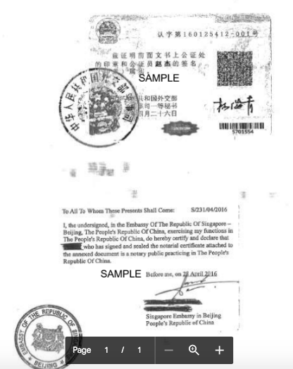 Your marriage certificate to be endorsed by the Ministry of Foreign Affairs of the People’s Republic of China AND further endorsed by the Singapore Consulate in the People’s Republic of China