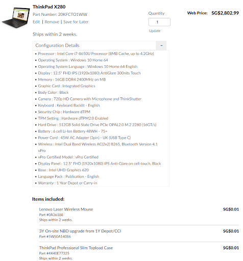 直接在新加坡联想官网找个本地学生 用学生折扣本地官网选择多 硬盘cpu显卡屏幕都可以定制逼美国官网选择多,我同事用学生折扣刚买了一个T480 256G固态硬盘8代i5才1400多 机械硬盘估计更便宜也就1200多而且官网买本免费三年上门维修和无线鼠标和包包邮