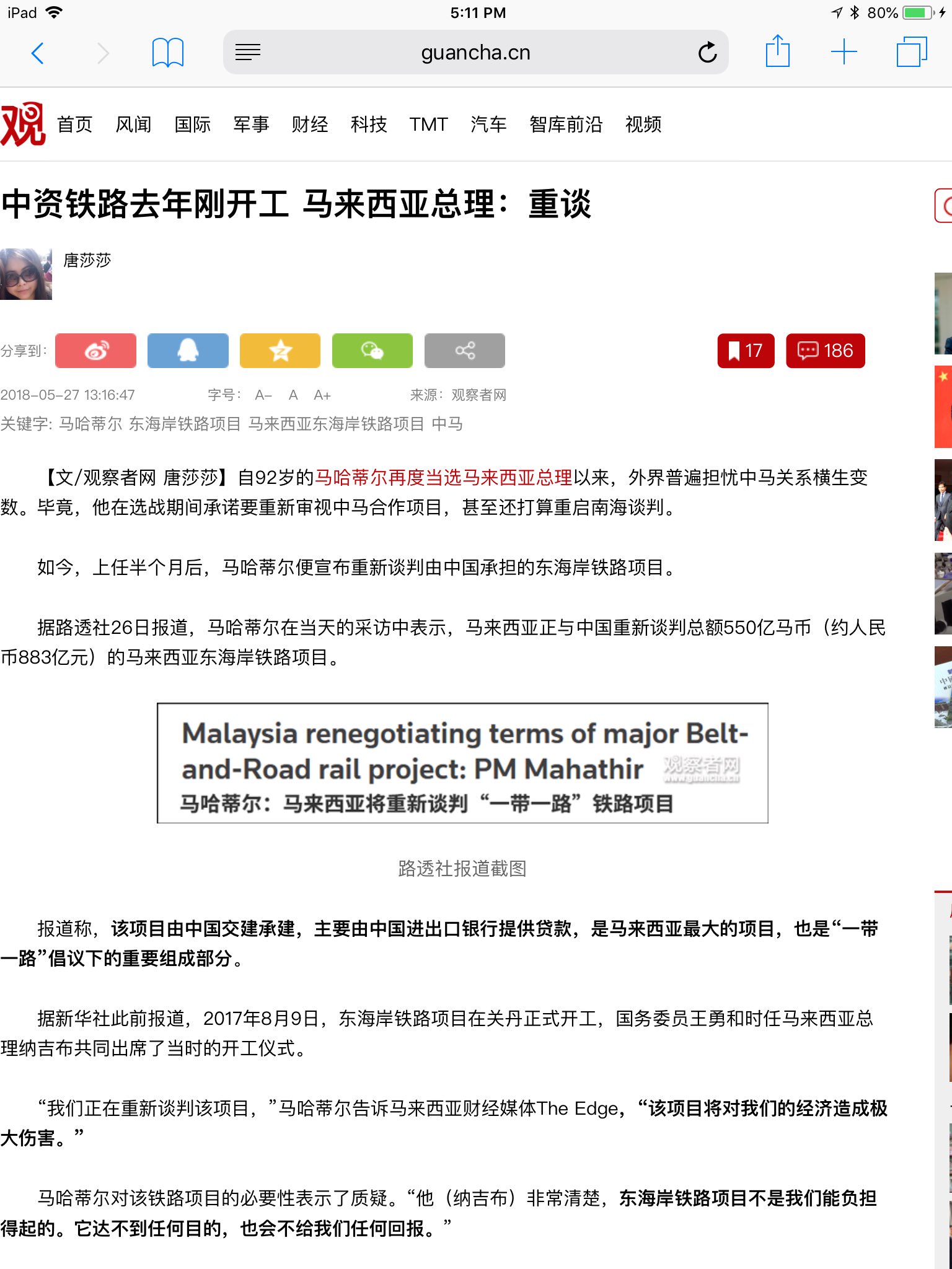 原文照贴【文/观察者网 唐莎莎】自92岁的马哈蒂尔再度当选马来西亚总理以来,外界普遍担忧中马关系横生变数。毕竟,他在选战期间承诺要重新审视中马合作项目,甚至还打算重启南海谈判。