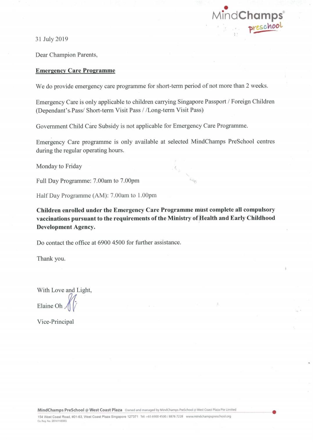 很些私立幼儿园有emergency childcare service我知道的有learning vision,superland,只要班级有位可以收。其他私立幼儿园也可以打听一下