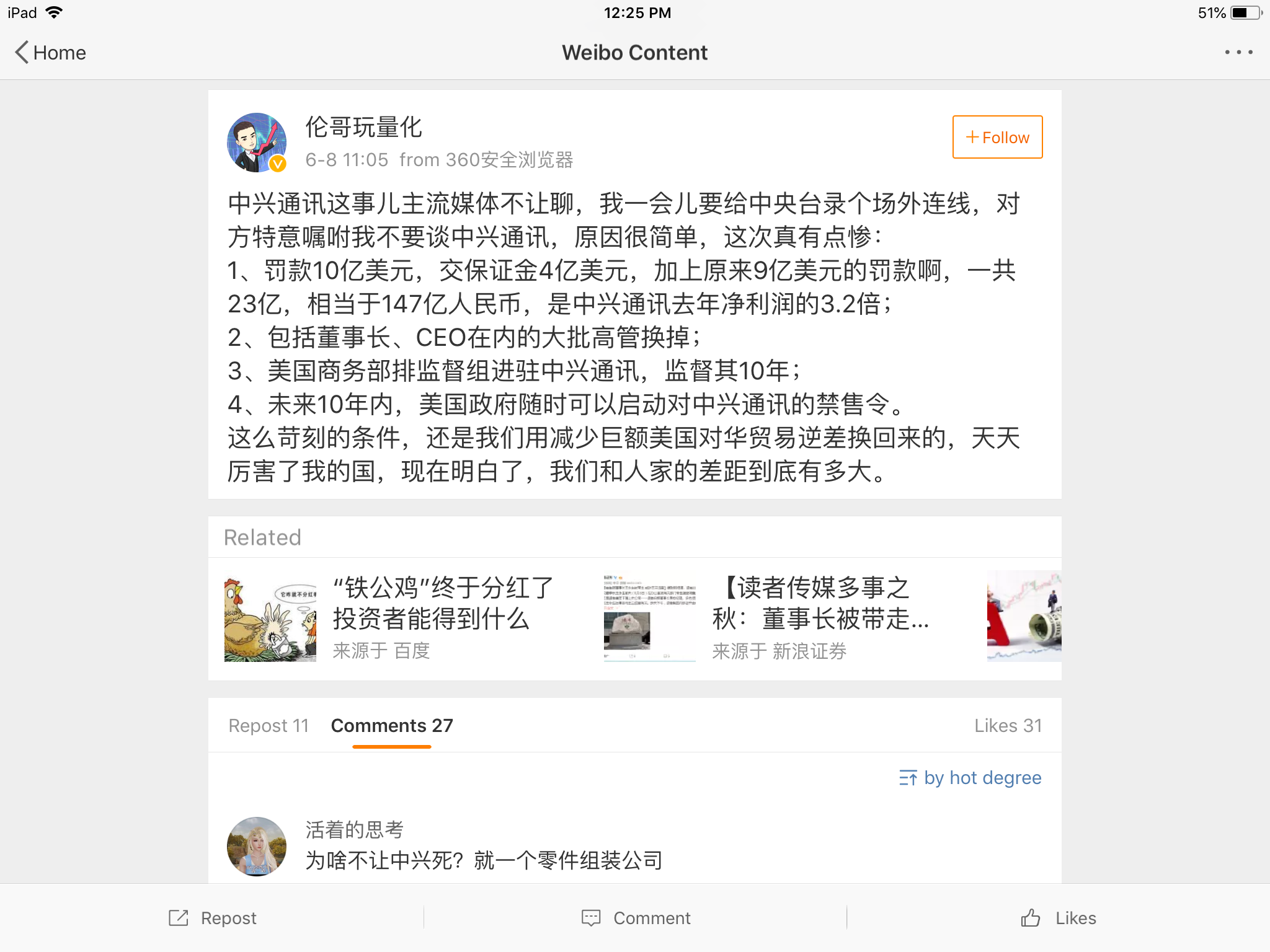 其实中兴的纠纷根本就不是商业纠纷 而是两国的政治博弈 现在都是state capitalism了,所有的国有企业都是为了political gain. 中国知道这一点,美国也知道这一点。美国拿中兴整治,是直接和中国在科技和made in china 2025这个擂台赛给个下马威。