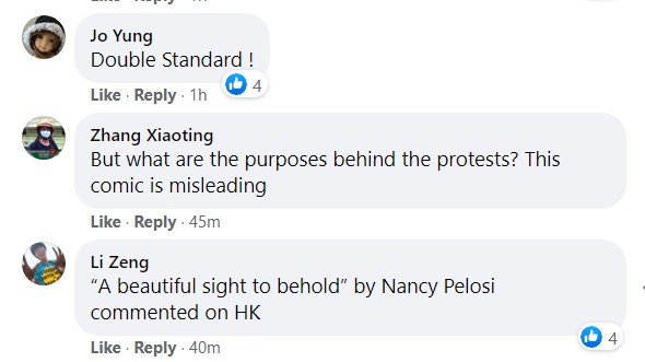 这组漫画首先刊登于新加坡《联合早报》,经新加坡一所高校的老师郭永秀发出后,被何晶转发。并被大多网友点赞。不少网民指责美国政府的“双标”做法,并批评此前佩洛西对香港的暴乱抛出的“美丽风景线”一说。